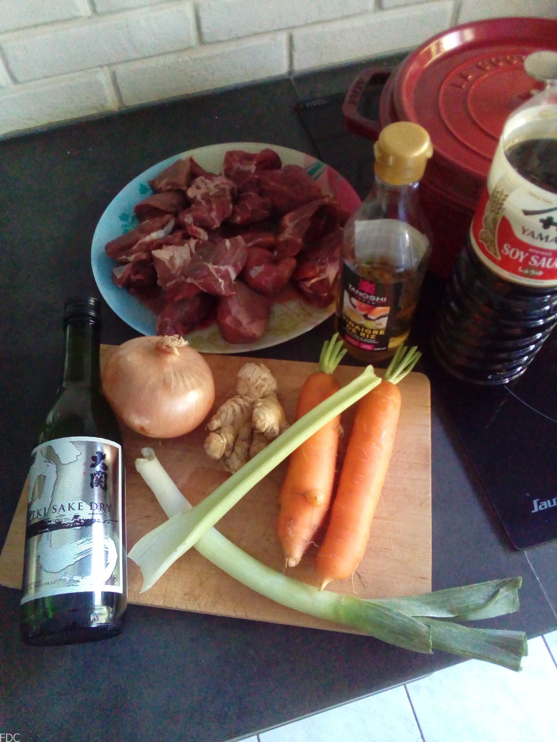Ce bœuf au saké et gingembre est en fait une recette fusion. Je disposais d’un paquet de bourguignon de bœuf d’Aubrac du G.A.E.C des Agudettes. Une viande remarquable de tendreté qui s’accorde totalement sur une recette de ce type. A ceci près que la cuisson est un mixte entre un Nikujaga et un bourguignon, en raison du morceau utilisé et d’un temps de cuisson plus long. Généralement dans les plats Japonais les morceaux sont émincés finement, ce que j’ai fait mais un peu moins fin afin de garder de la mâche et que la marinade imprègne la viande sans trop la cuire.