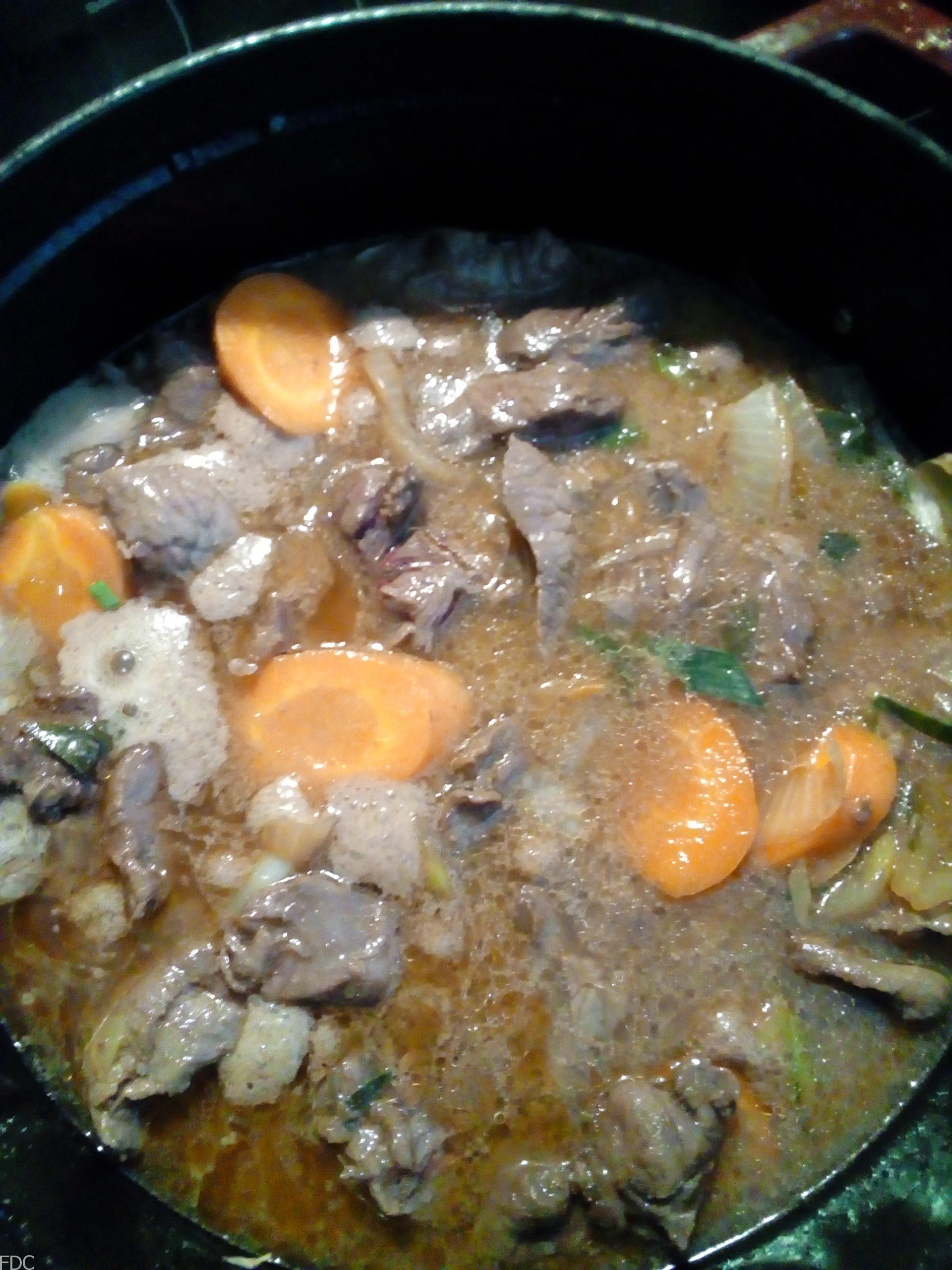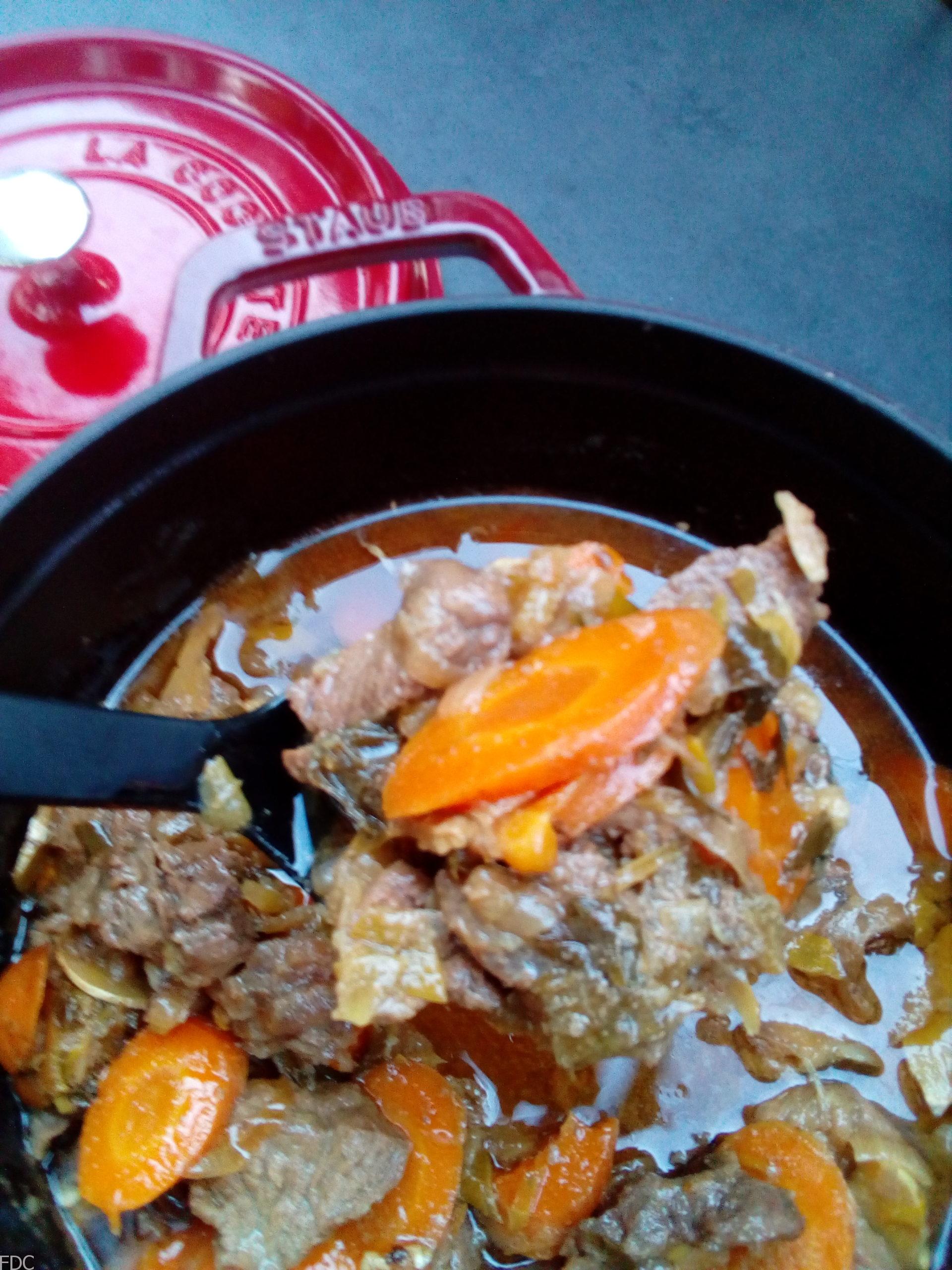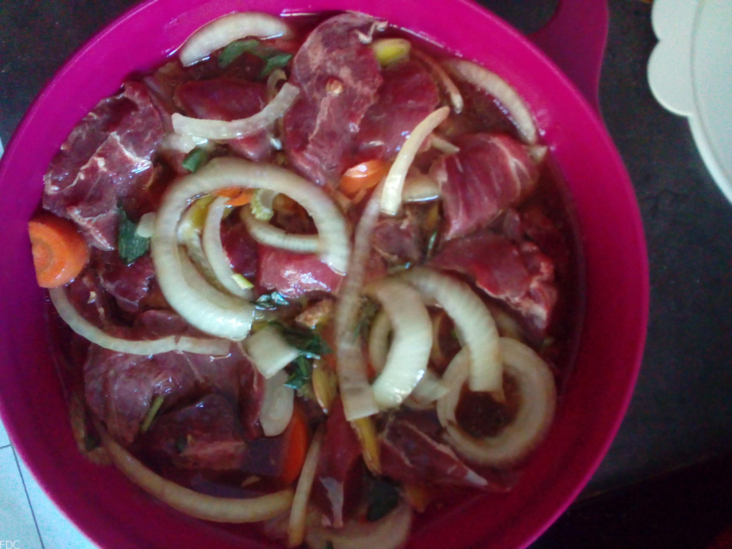 Remettez la viande, mélangez, et mouillez avec la marinade. Normalement ça doit couvrir, sinon ajoutez du bouillon ou un peu d’eau. Portez à ébullition et baissez le feu pour cuire à frémissement durant 1 h 30 environ. La bonne cuisson est lorsque la viande commence à être fondante. Vous stoppez la cuisson et laissez tranquillement reposer pour détendre la viande.