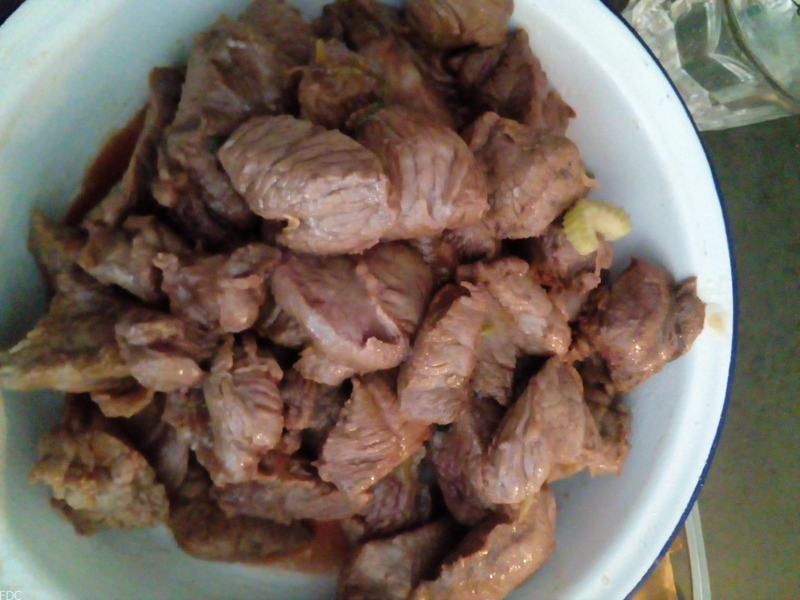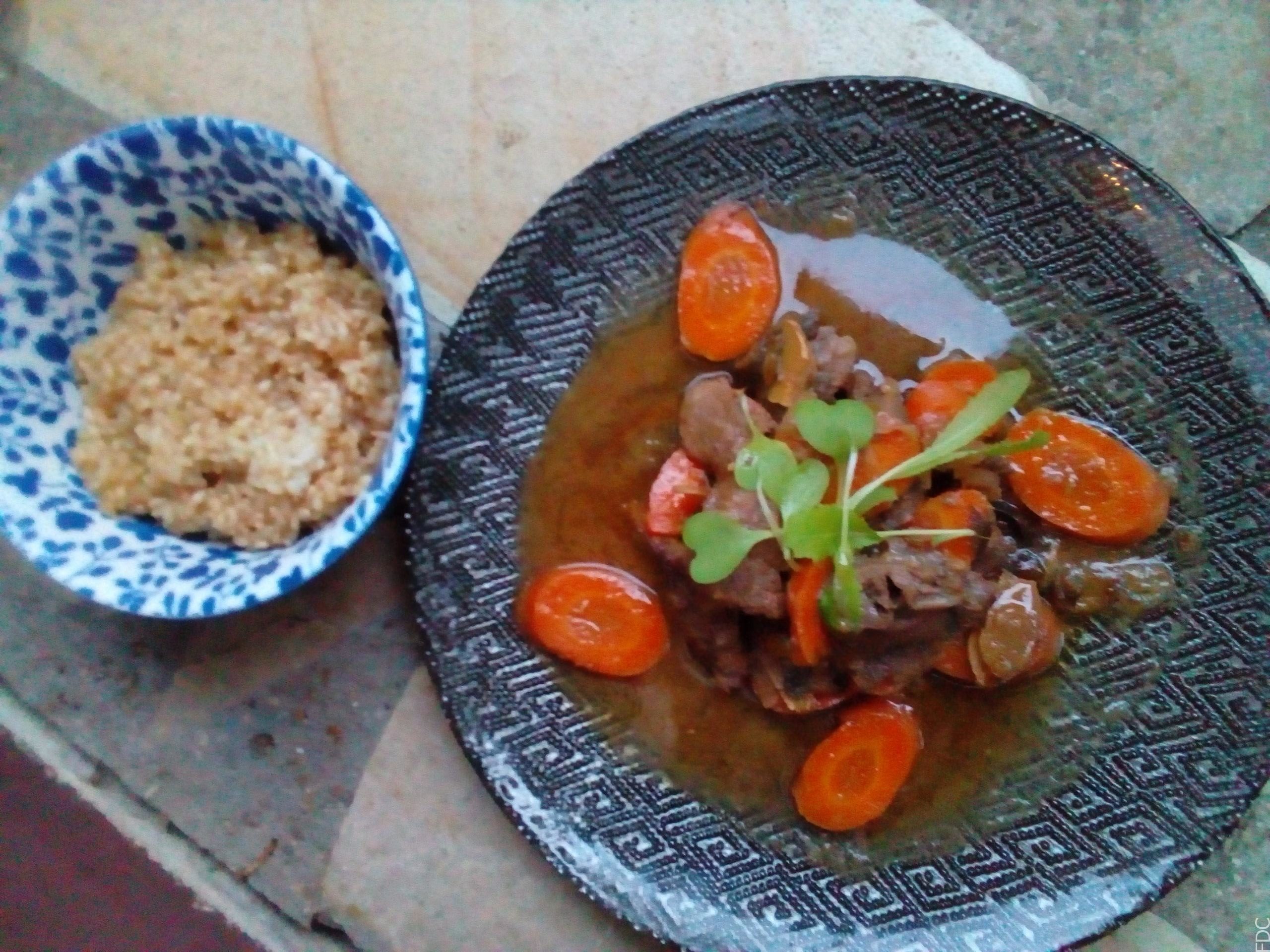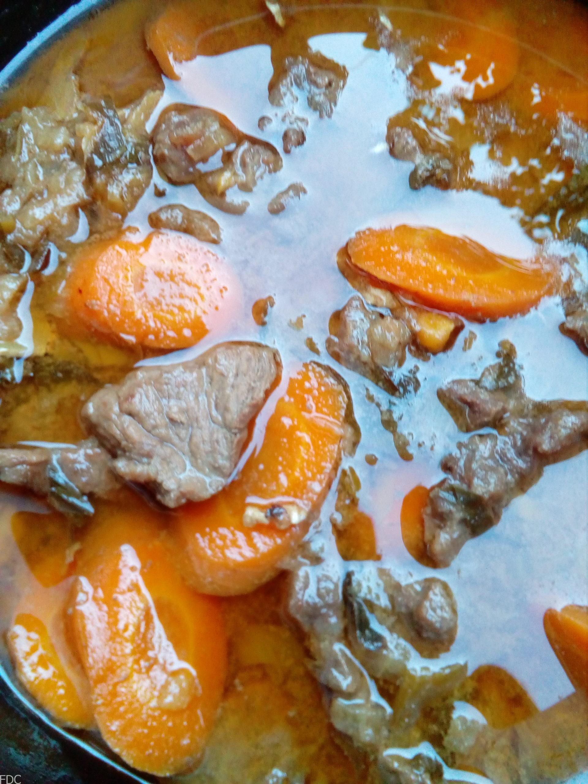 Remettez la viande, mélangez, et mouillez avec la marinade. Normalement ça doit couvrir, sinon ajoutez du bouillon ou un peu d’eau. Portez à ébullition et baissez le feu pour cuire à frémissement durant 1 h 30 environ. La bonne cuisson est lorsque la viande commence à être fondante. Vous stoppez la cuisson et laissez tranquillement reposer pour détendre la viande.