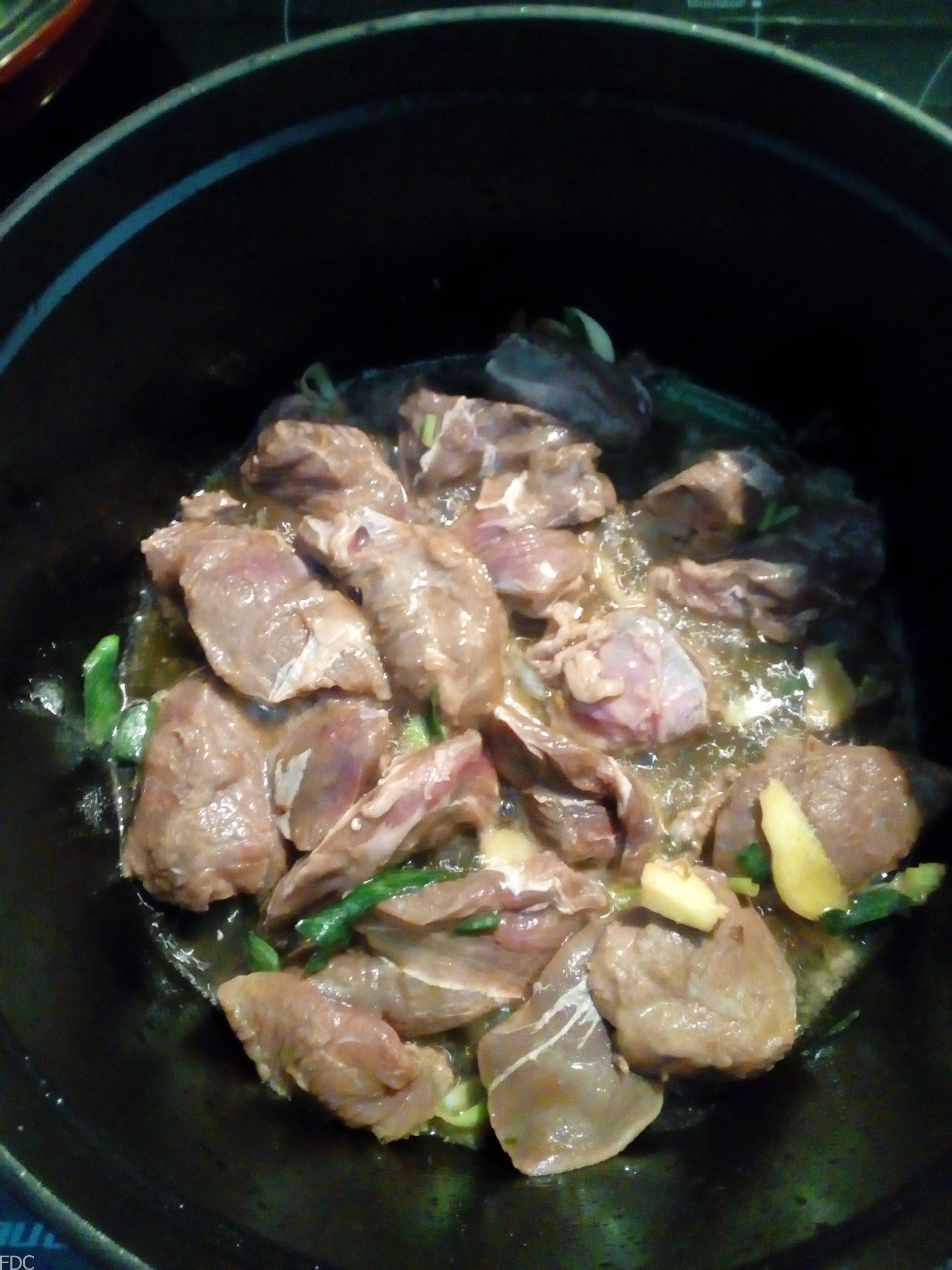Égouttez la viande et faites-la saisir avec de l’huile de sésame dans une cocotte. Faites-le en plusieurs fois de manières à ce que les morceaux ne se chevauche pas et soient bien saisis.