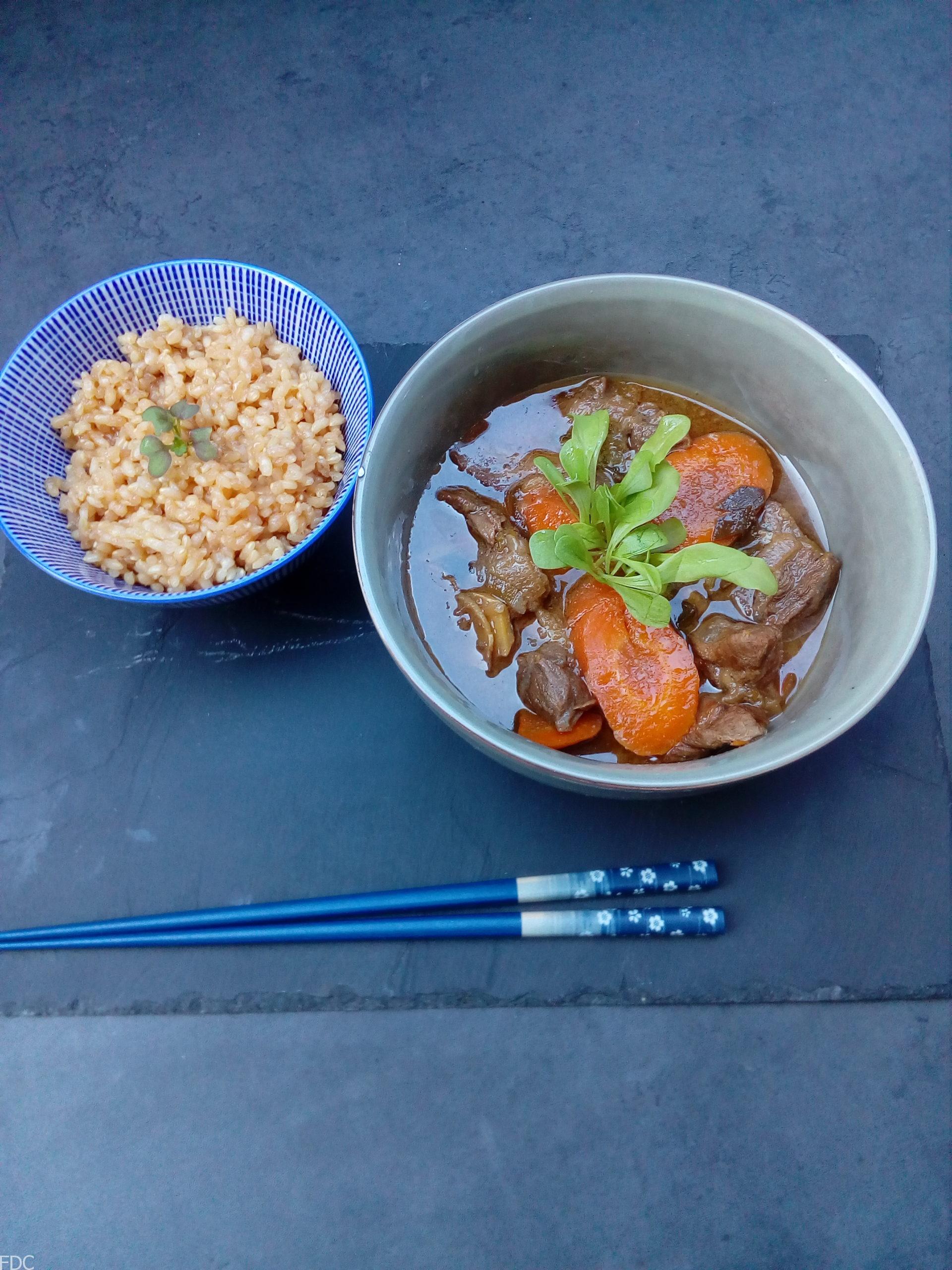 J’ai fait le choix d’un riz complet Japonais. Parce qu’il est gustativement adapté à ce plat et ça change du riz blanc. Mais vous pouvez utiliser un riz Jasmin ou parfumé. Le riz Japonais que j’ai choisi, je l’ai rapporté lors de mon séjour à Kyoto. Cultivé artisanalement aux environs de la ville. Un parfum unique, difficile à cerner mais tellement bon et soyeux.