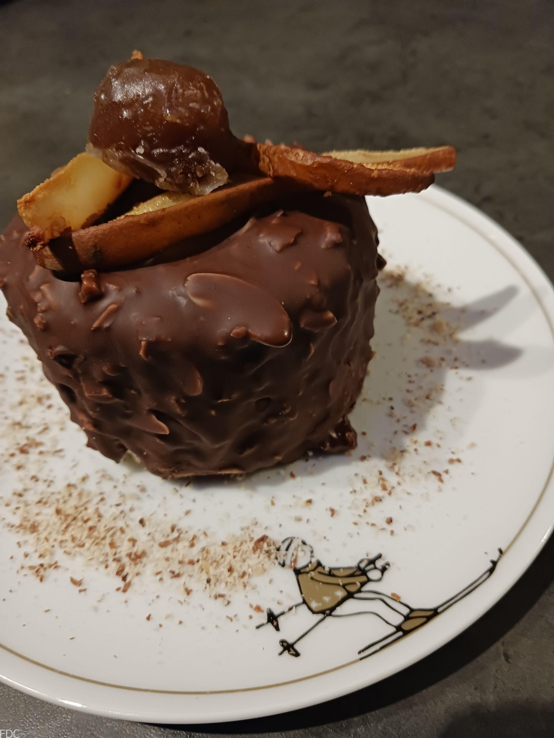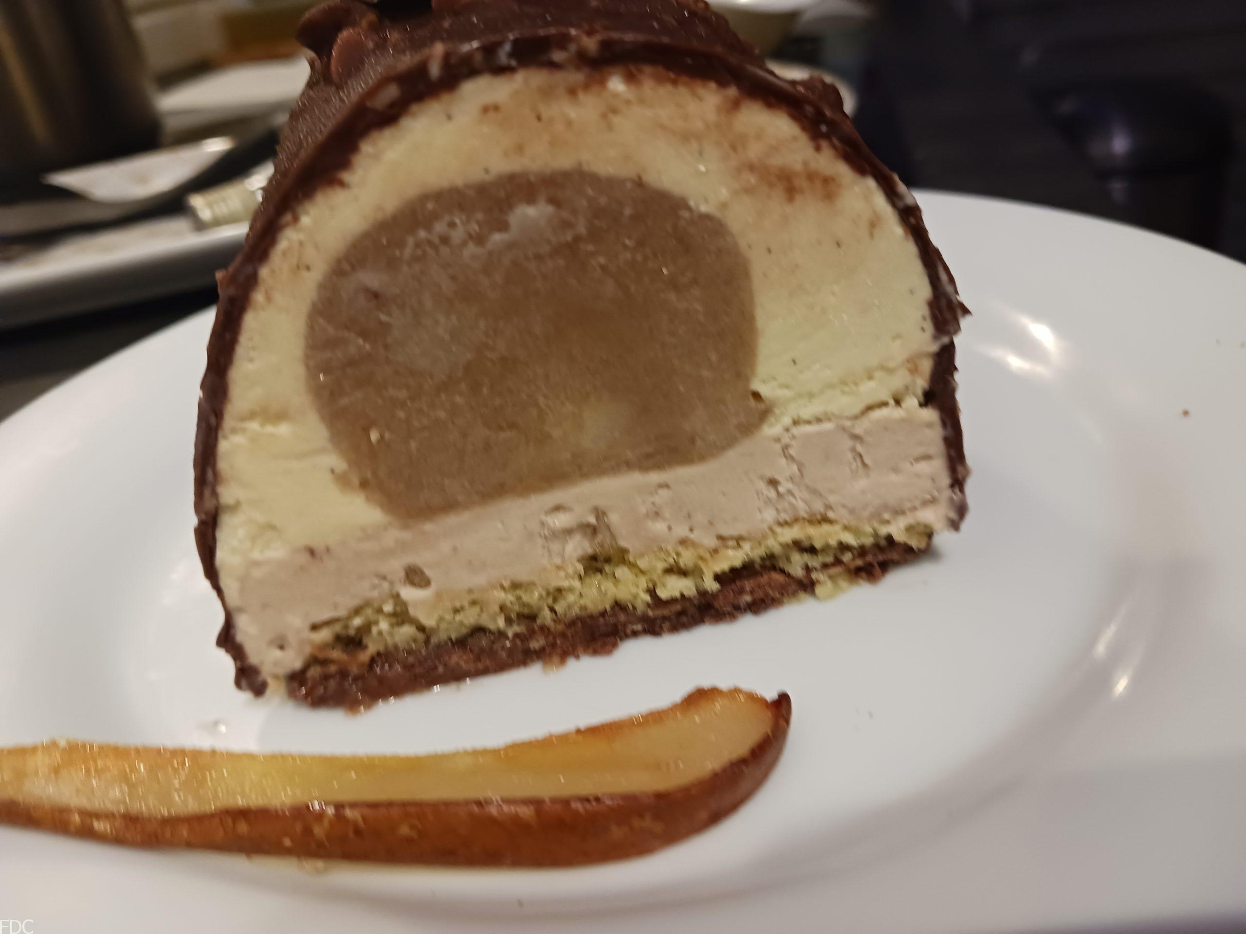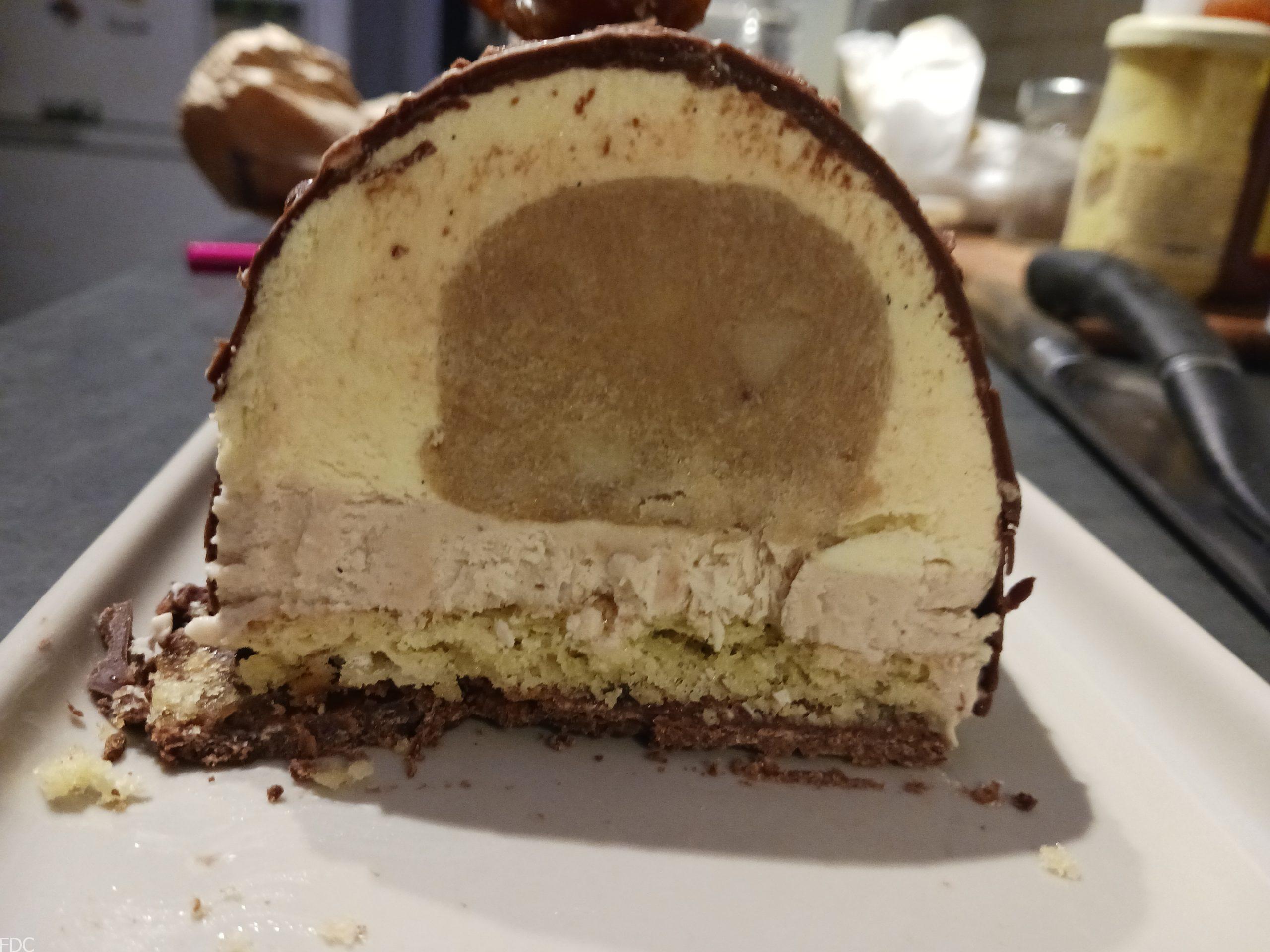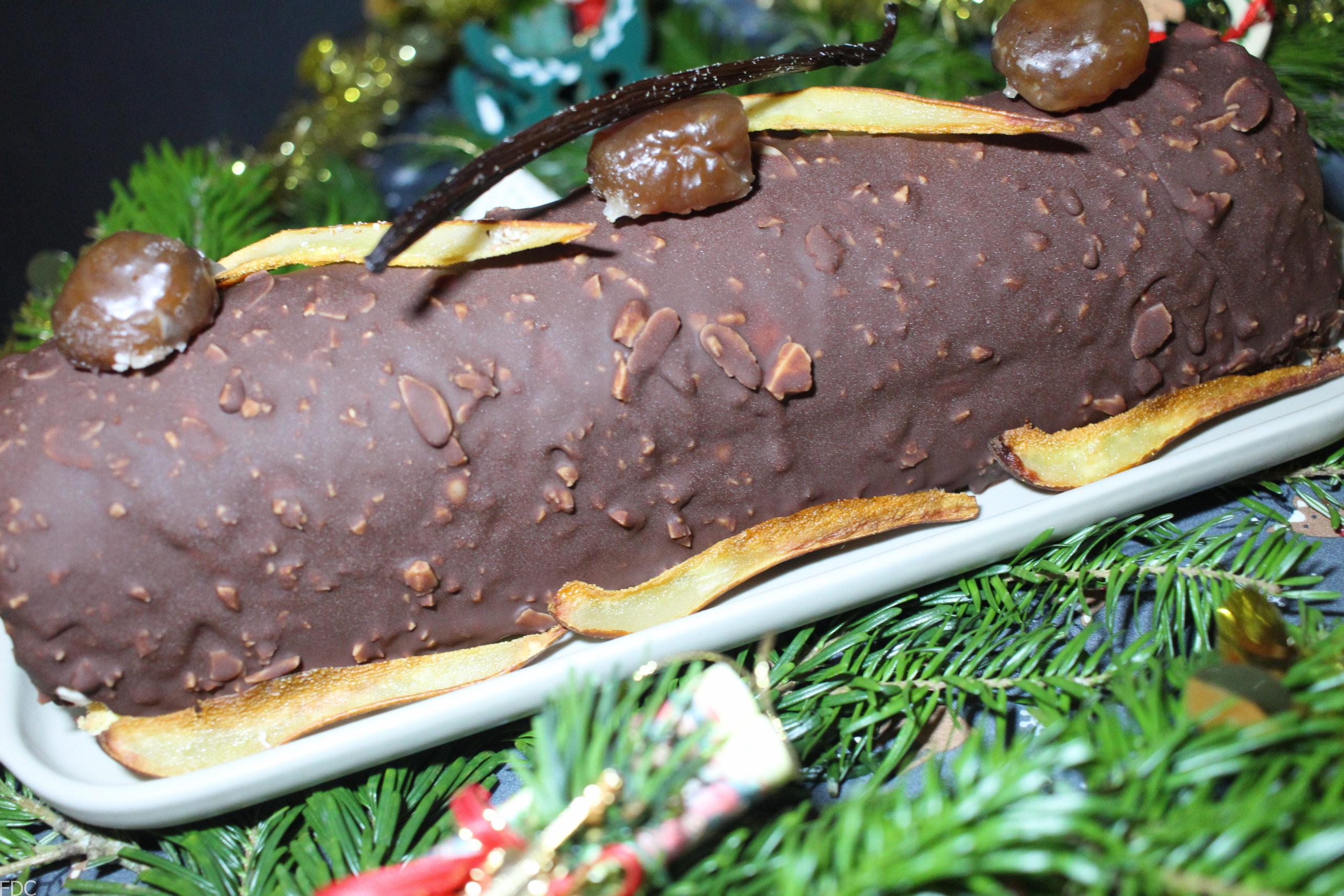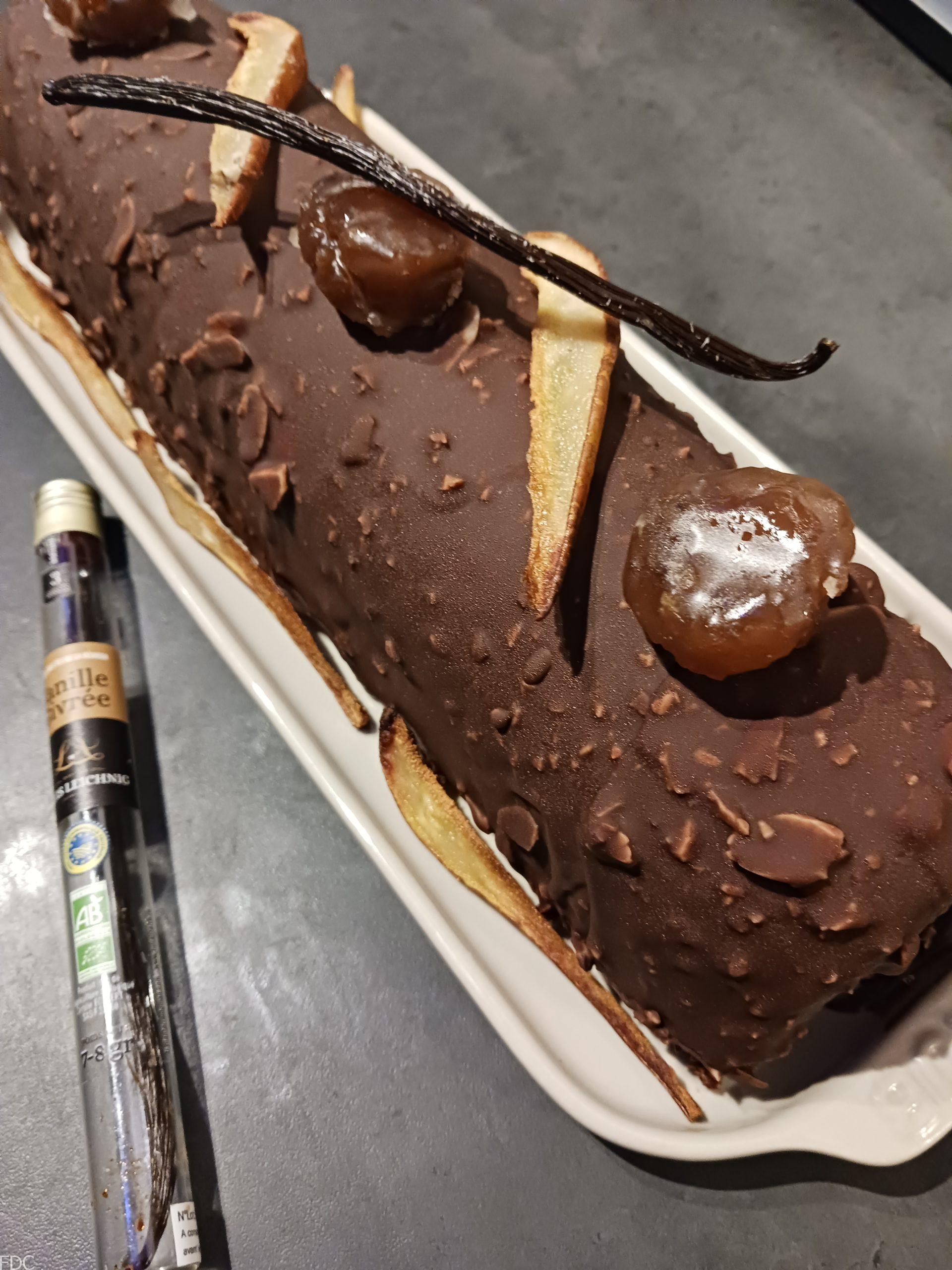Pour cette bûche je l’ai utilisé comme insert entouré d’une mousse Bavaroise à la vanille Givrée Bio IGP de la Réunion (exceptionnelle) de Louis Leichnig et d’une ganache aux marrons sur un socle de génoise imbibée à la williamine Morand et une feuillantine à la pâte à Tartiner Dupont (Normandie).
