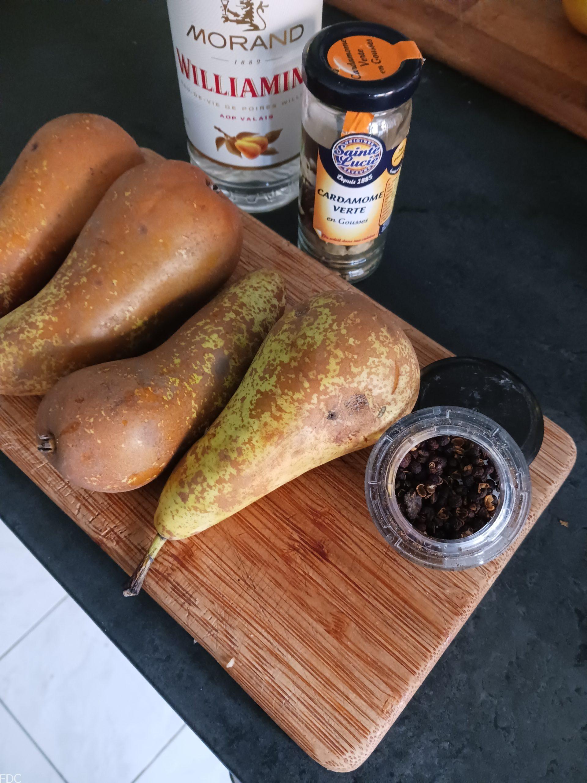Dans une casserole mettre à cuire doucement 400 g de poires mûres épluchées en morceau avec la cardamome verte et le poivre. Tailler une poire en petite brunoise et mettre de l’eau de vie de poire pour éviter que ça noircisse.