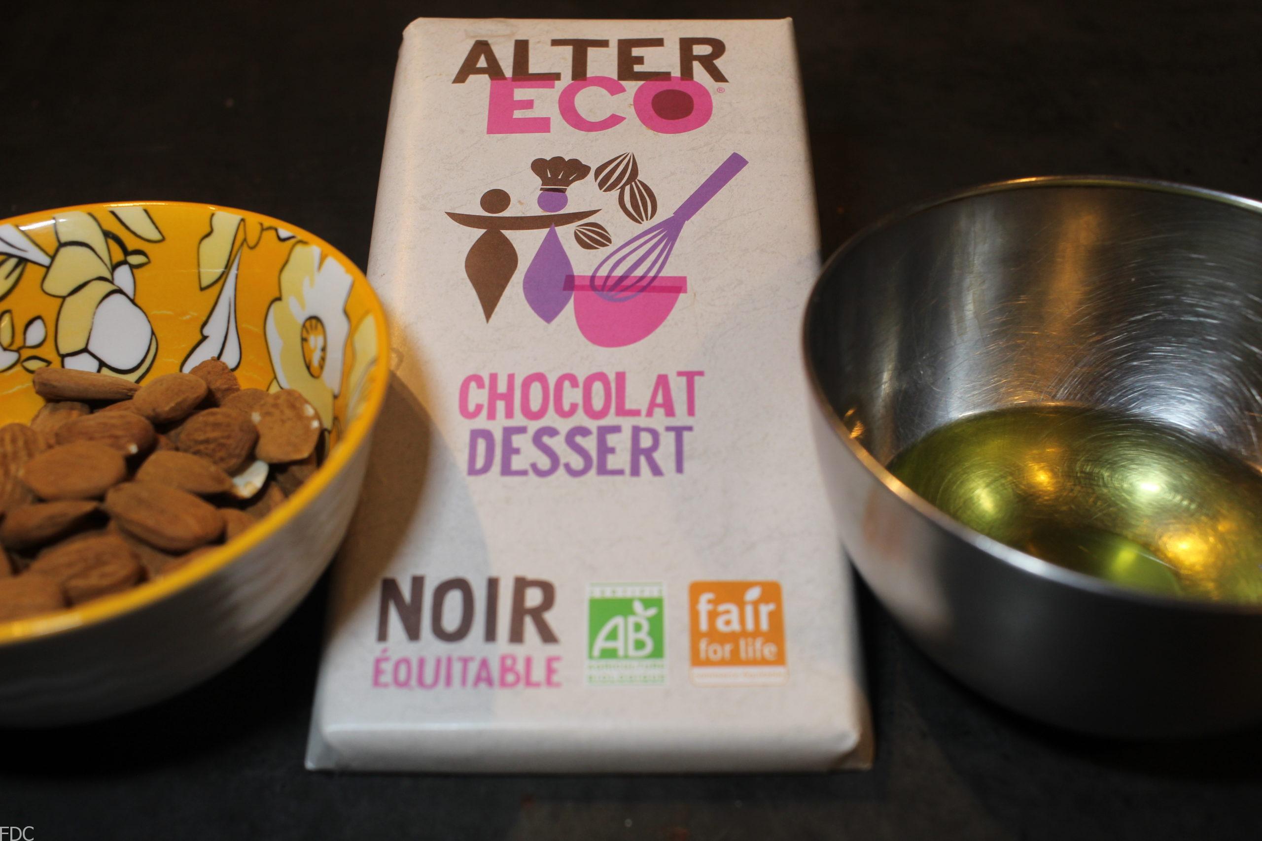 Faire fondre le chocolat au bain marie, ensuite ajouter doucement l’huile et enfin les amandes hachées et/ou effilées.