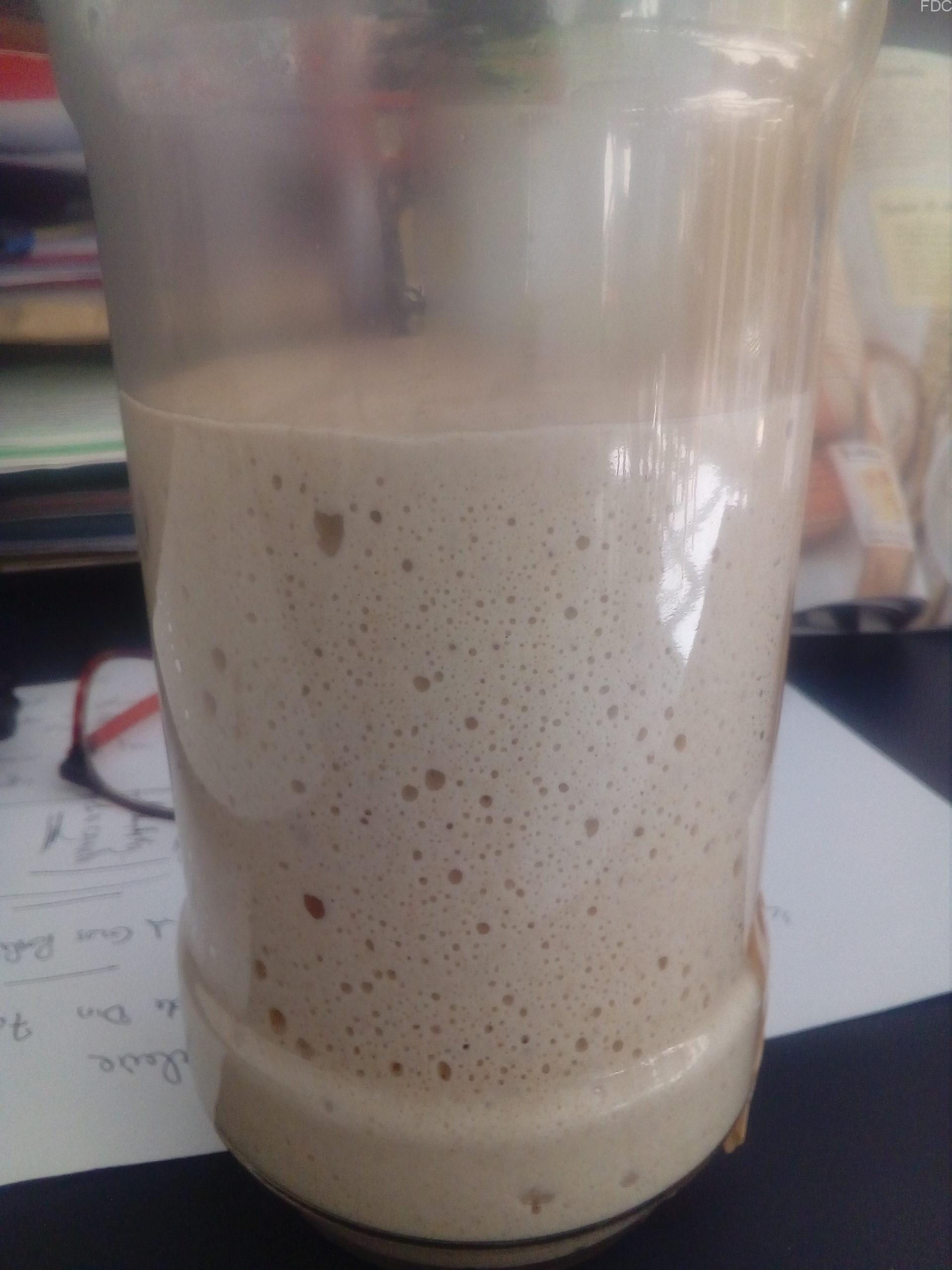 Au préalable vous aurez rafraîchi deux fois votre levain, ceci au moins 6/8 h avant de démarrer votre pâte car un rafraîchi dure environ 3 h x 2 et quand vous sortez votre levain, comptez le temps de remise à température (le réveil du Levain)