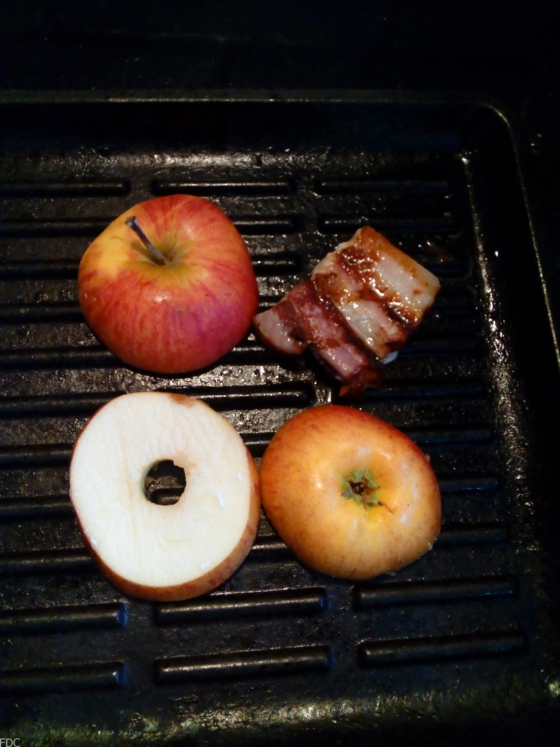 Faites griller les tranches de lard et ensuite quadriller sans vraiment cuire les chapeaux et culs des pommes. Les pommes doivent rester fermes et croquantes à cœur.
