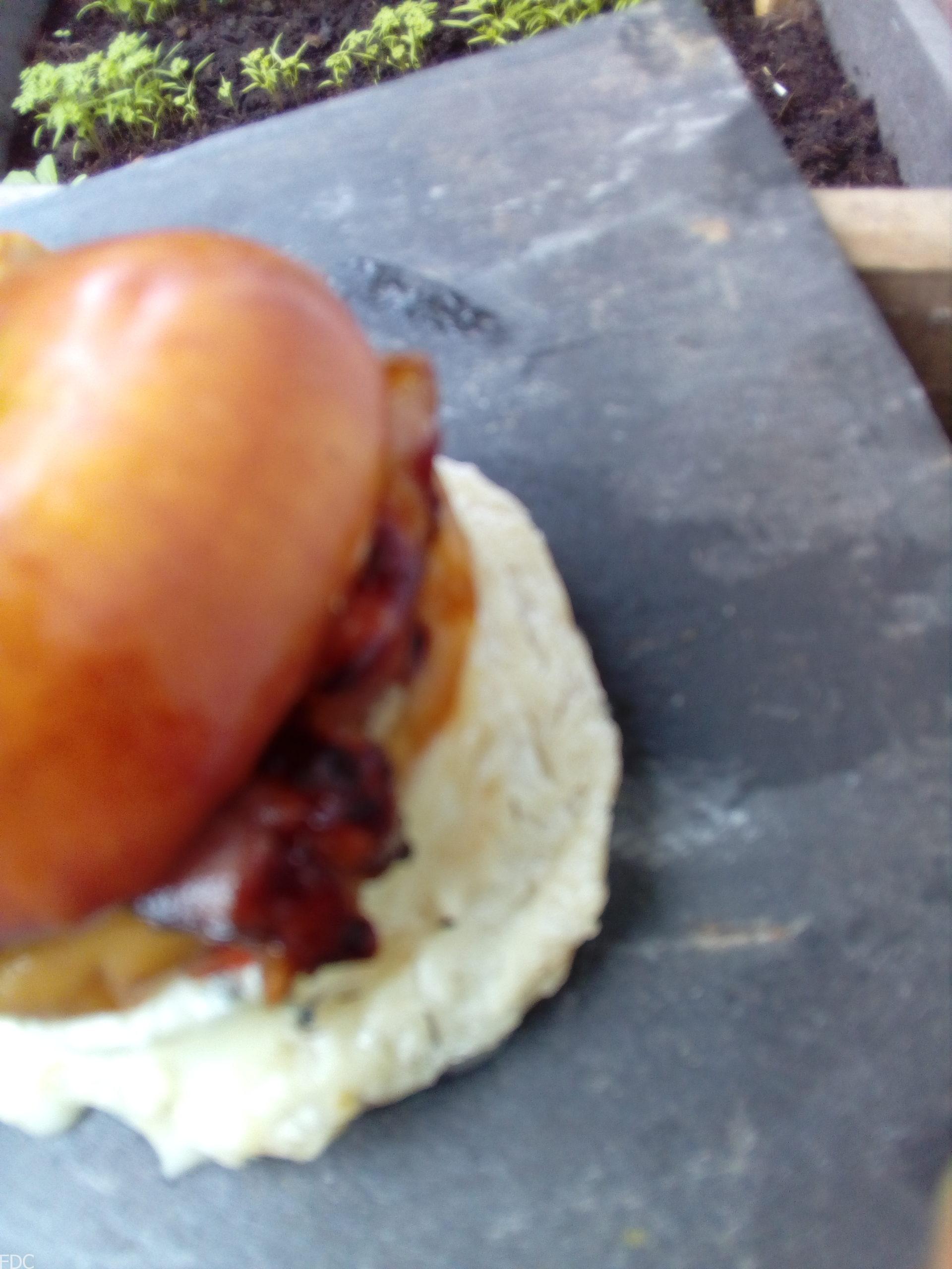 Sur une plaque allant au four couvert d’une feuille de papier cuisson, montez vos burger cul de pomme + chèvre + pomme* + lard + chapeau de pomme