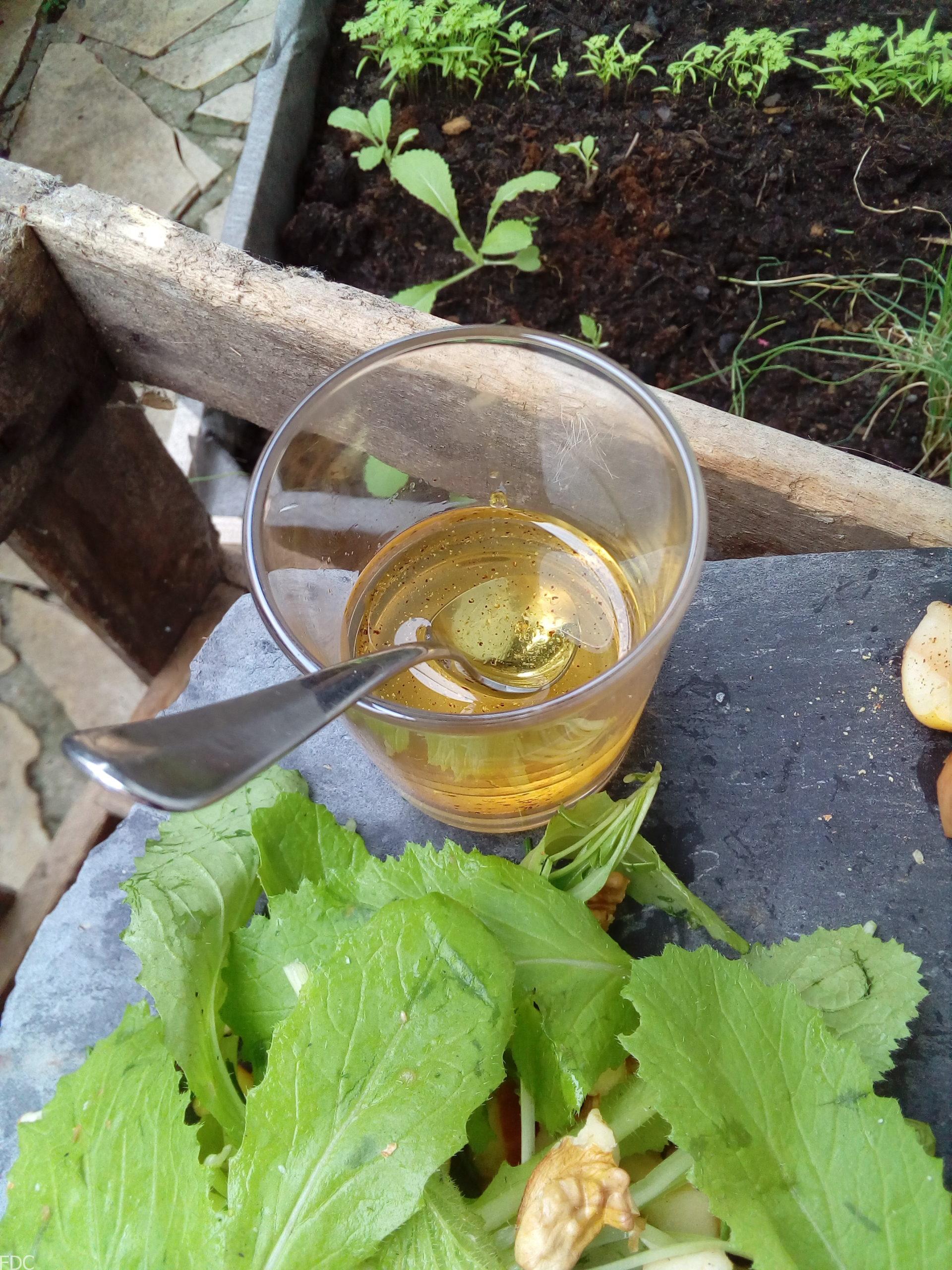 Vinaigrette : Vinaigre de cidre, huile de tournesol, sel poivre, une cuillère à café de miel.