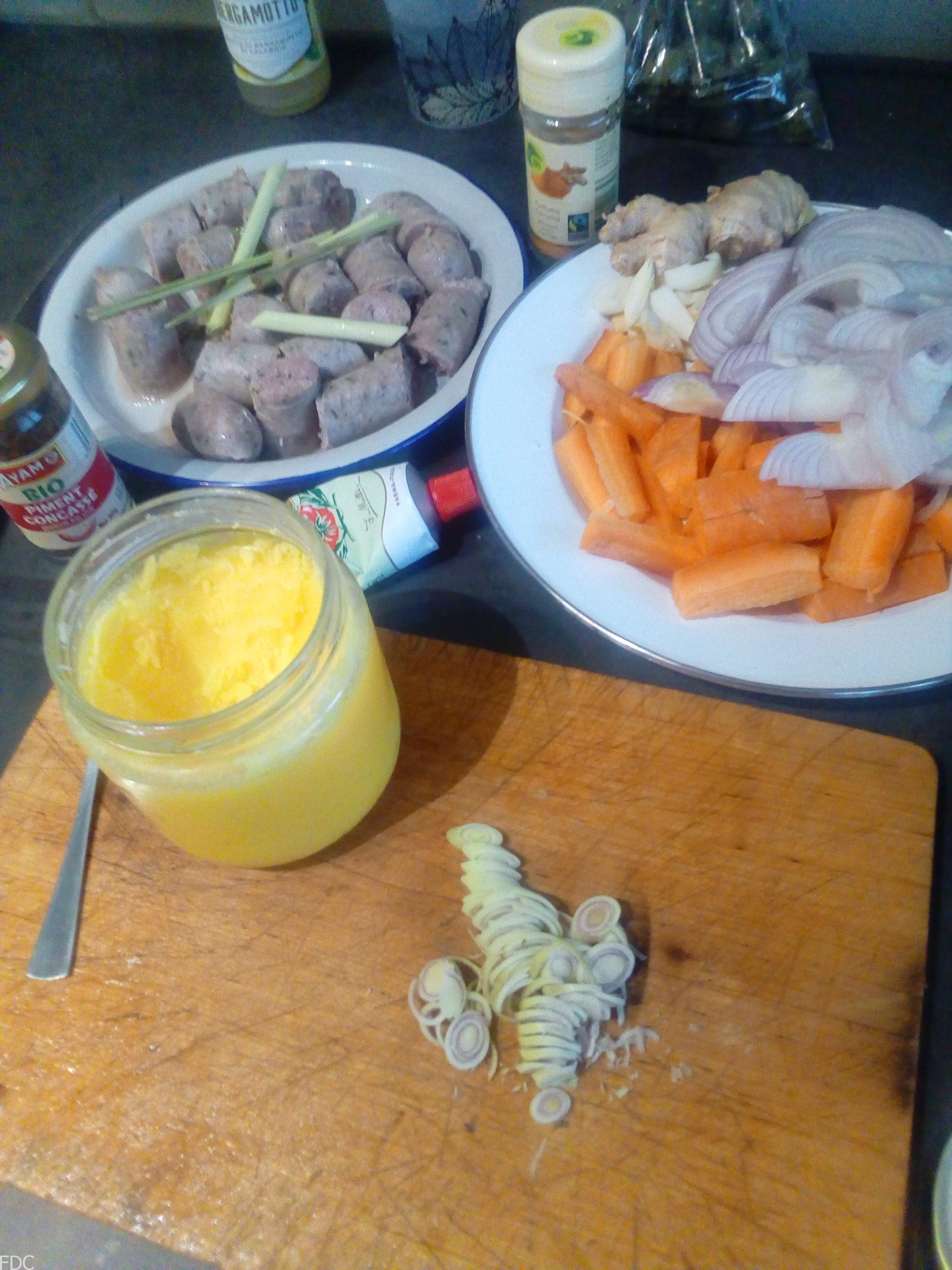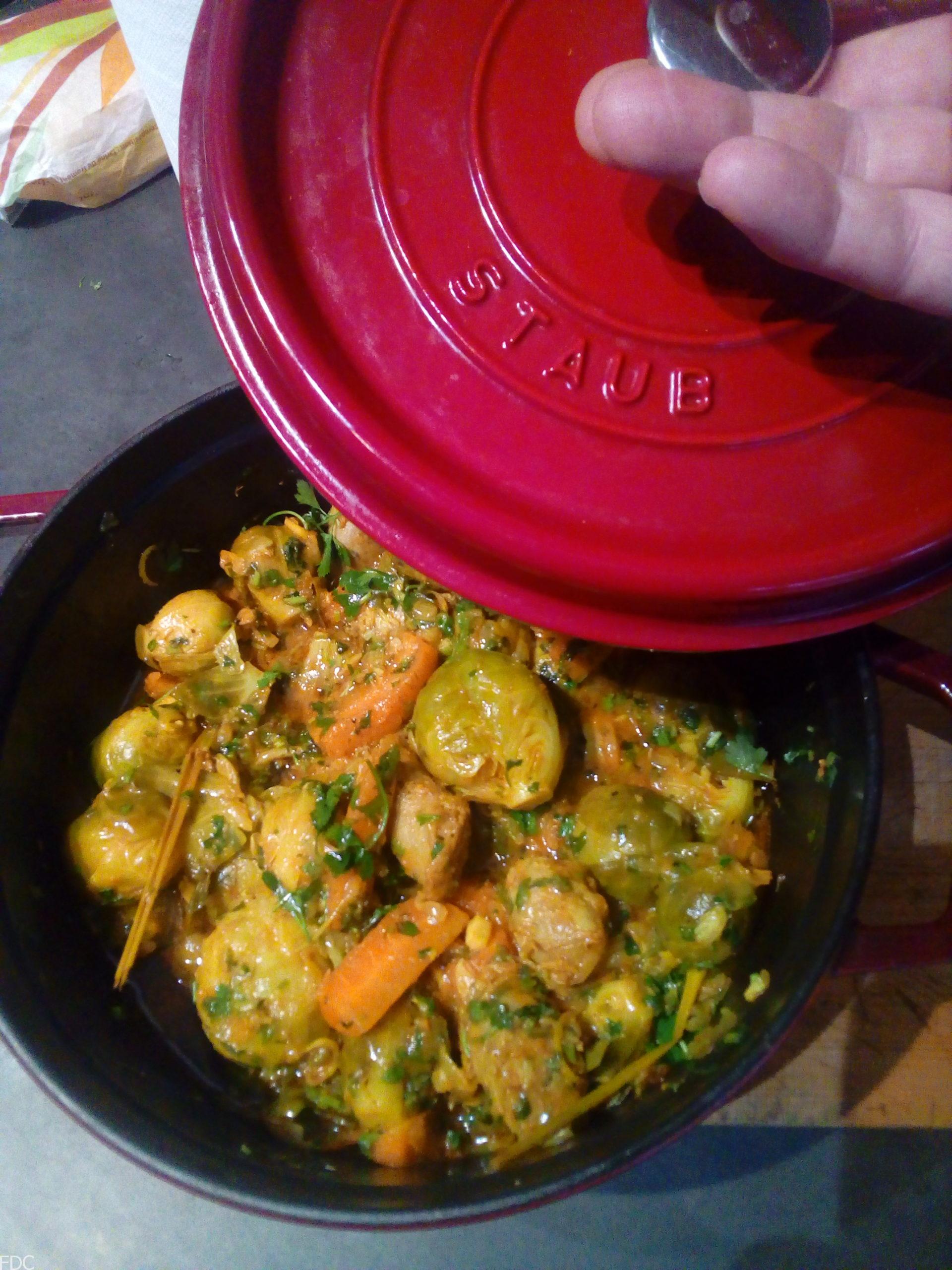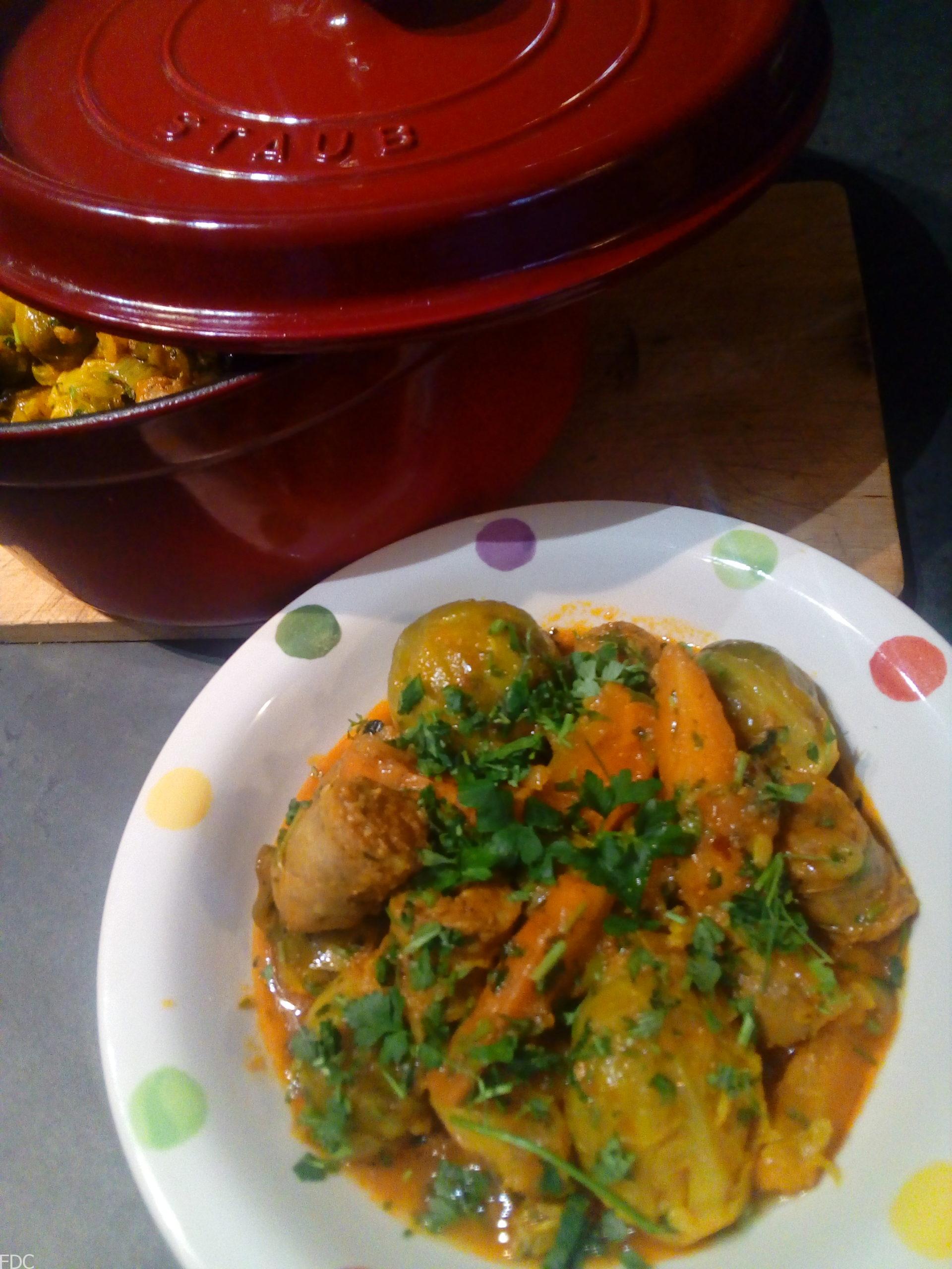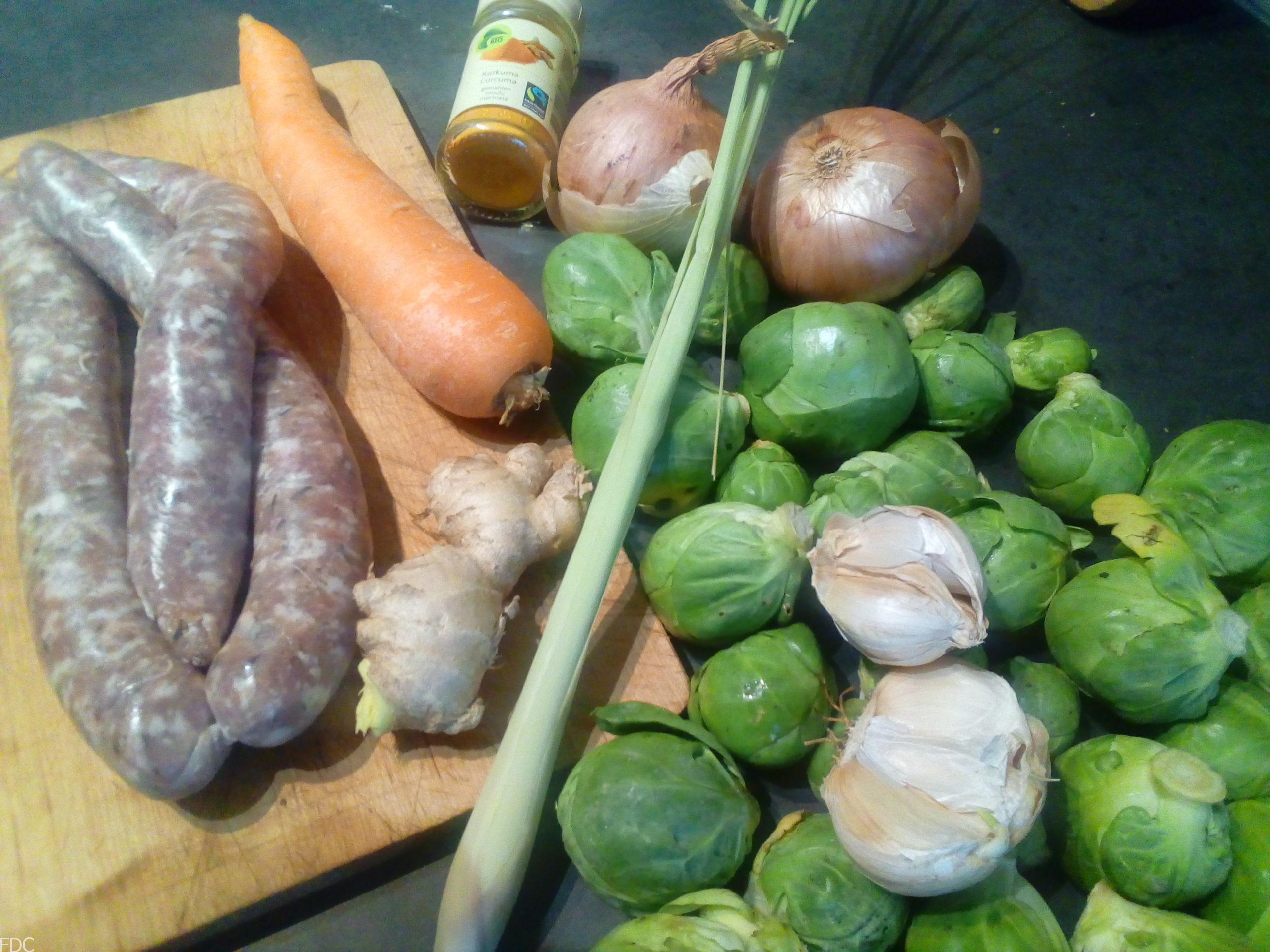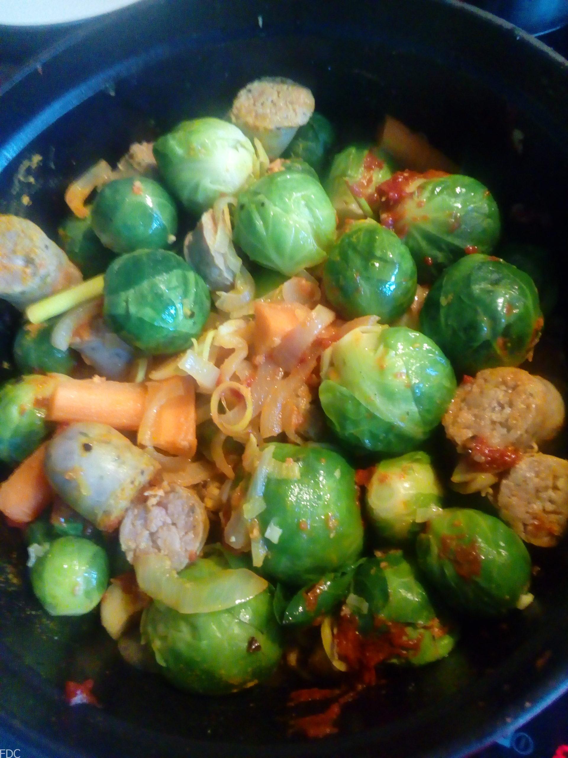 Cette recette de choux de Bruxelles entre Potée et Rougail est une idée venue en faisant le marché dimanche matin. Quand on n’arrive pas à se décider sur une recette, et bien on les fusionne? Avec une saucisse Créole maison de mon traiteur Réunionnais et de jolis choux de Bruxelles de mon maraîcher local, il m’a suffi de les réunir et d’apporter des saveurs exotiques.