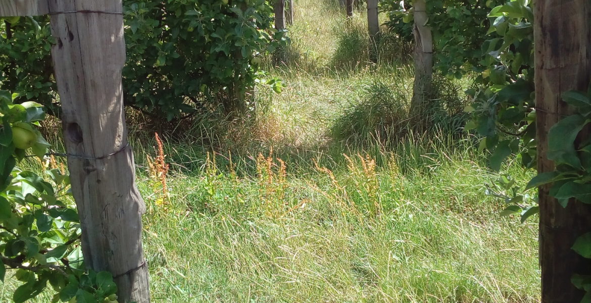 Le mode de culture traditionnelle en Palmette(palisse), en lutte intégrée biologique. Même s’il est difficile de cataloguer son mode de culture, Bernard n’utilise pas de traitement chimique au possible, sauf cas extrême. Quand on visite son verger (9 juillet 2020 sur les photos actuelles) comme j’ai pu le faire avec son éclairage passionné, on se rend compte que la nature et la vie est bien présente. Pour la pollinisation des ruches sont installées et au moment où j’ai visité tous ces insectes sont encore présent, avec la présence de trèfle fleuri, et autres herbes parfois hautes, qui évitent à certains insectes d’aller cherche à manger sur l’arbre quand ils ont à manger au sol.