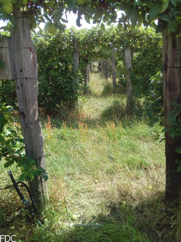 Les arbres ont jusqu’à 40 ans. Les premiers ont été plantés lors de l’acquisition de la terre qui n’était pas initialement un verger. Parcelle exposée au gel d’où le choix d’un verger palissé. Ce qui n’exclue pas la perte importante de récolte (presque 100% en 2018), mais qui protège sur les petites gelées.