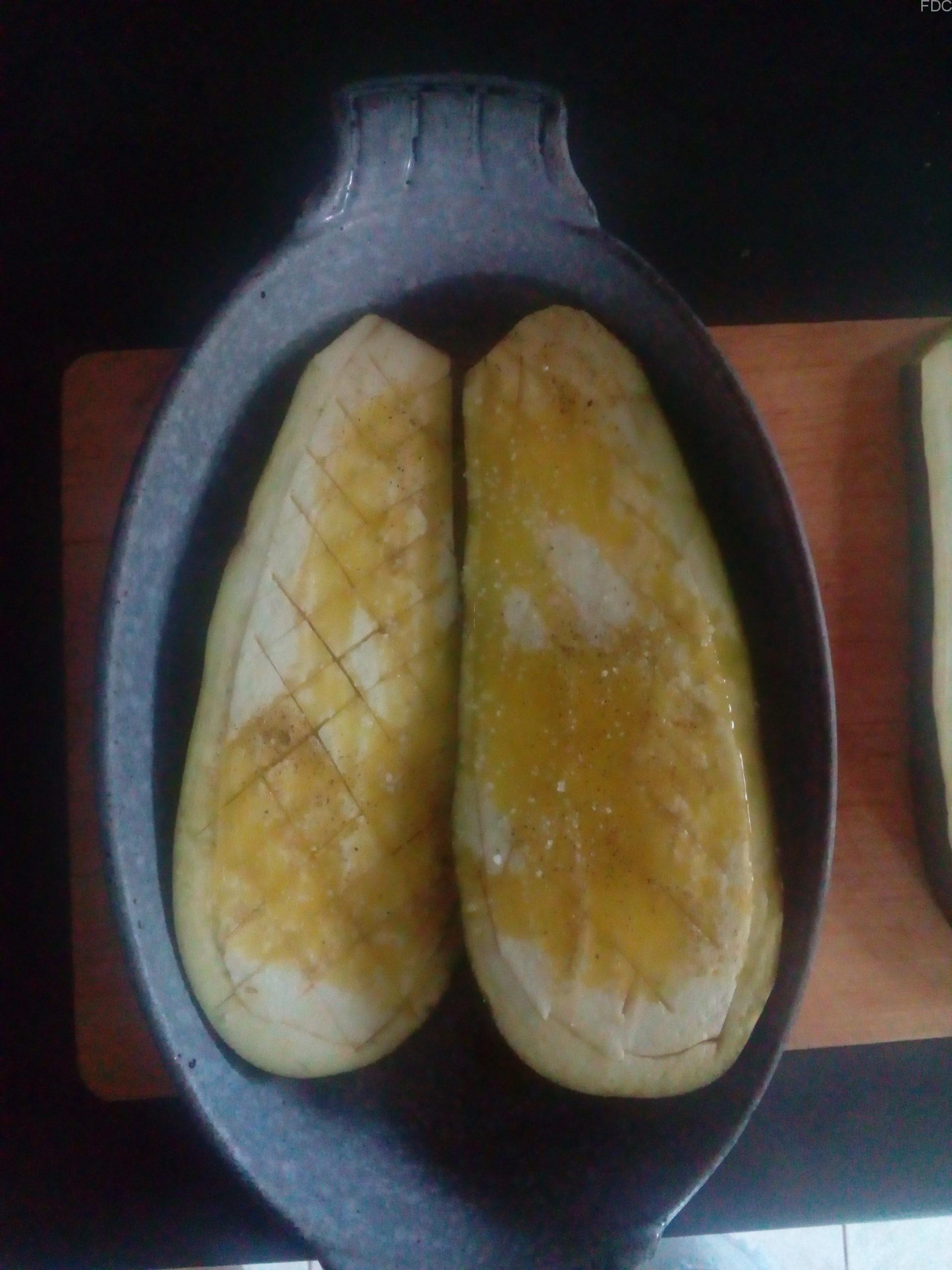 Première moitié à cuire au four pour faire un caviar. Quadrillez profondément la chair, huile d’olive, sel et poivre. Cuire 15/20 minutes à 200 °
