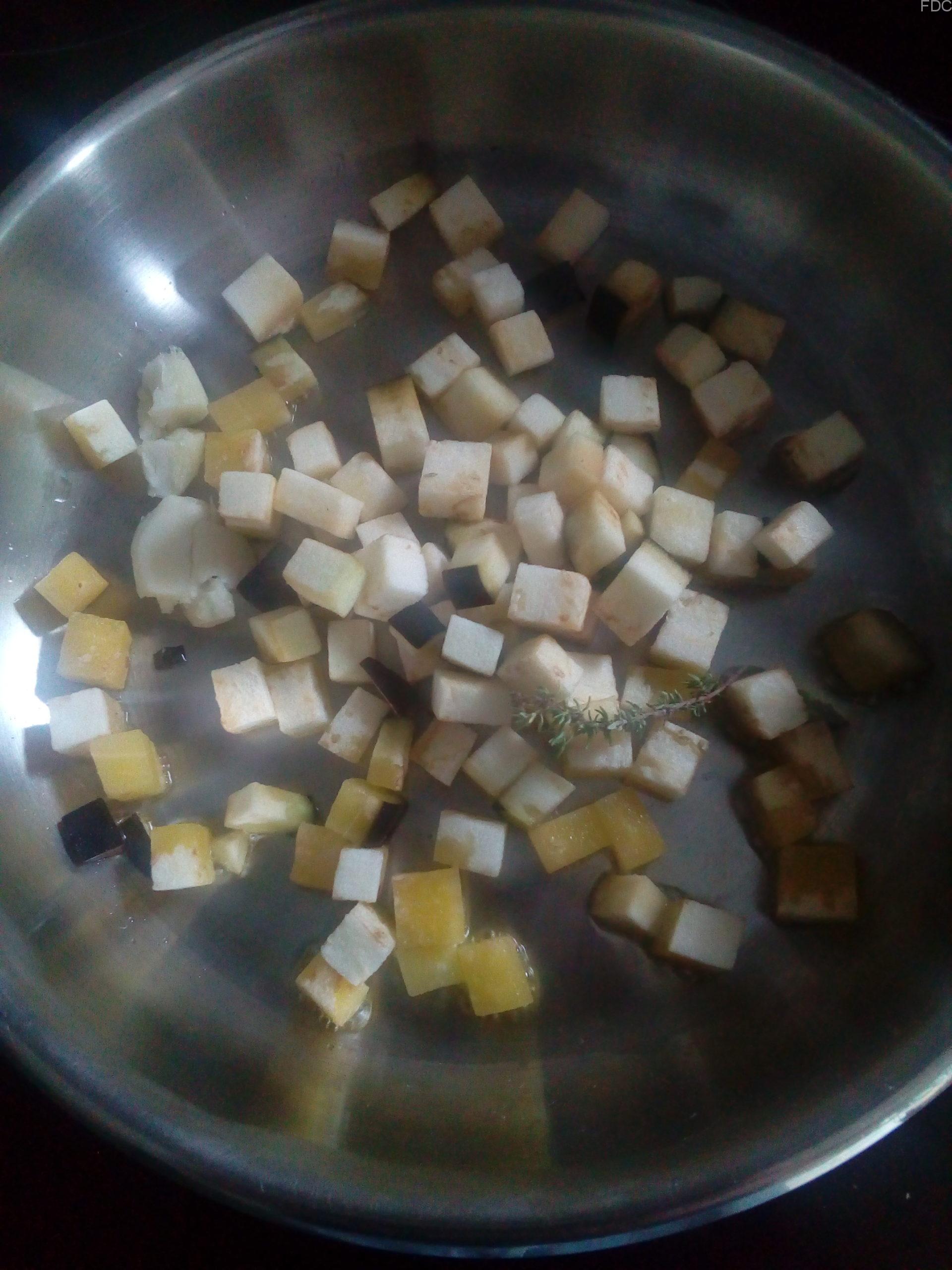 L’autre moitié, coupez-la en très petits dés. Faites chauffer dans une poêle de l’huile d’olive, une gousse d’ail écrasée, une branche de thym, saisissez les dés d’aubergines en colorant sans les cuire entièrement durant 2 minutes. Égouttez et réservez.