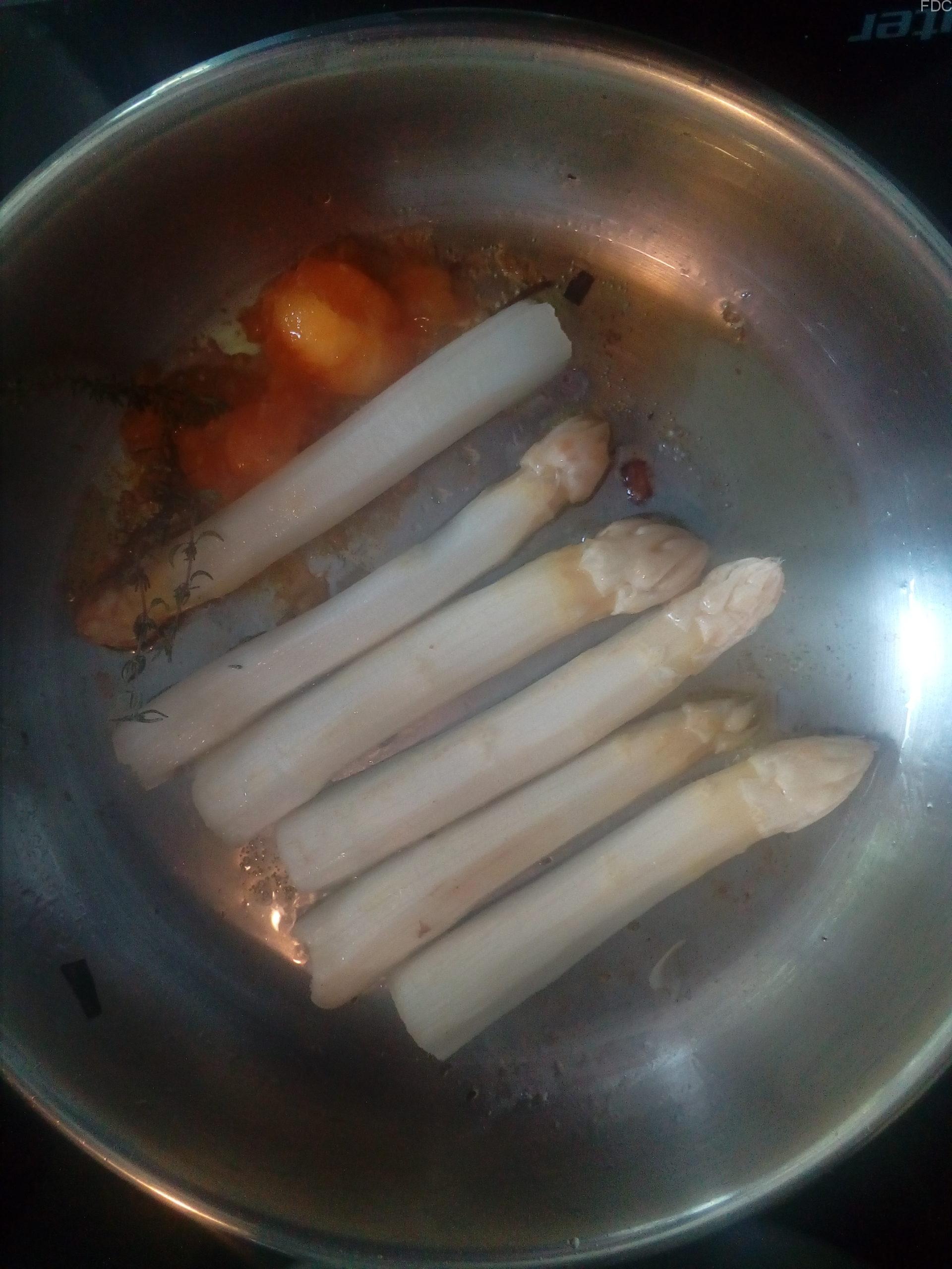 Dans une casserole, un peu d’huile d’olive, deux gousses d’ail, les queues et épluchures d’asperges, faire suer 2 minutes, mouillez à hauteur (eau + 10 cl de fumet), une branche de thym.