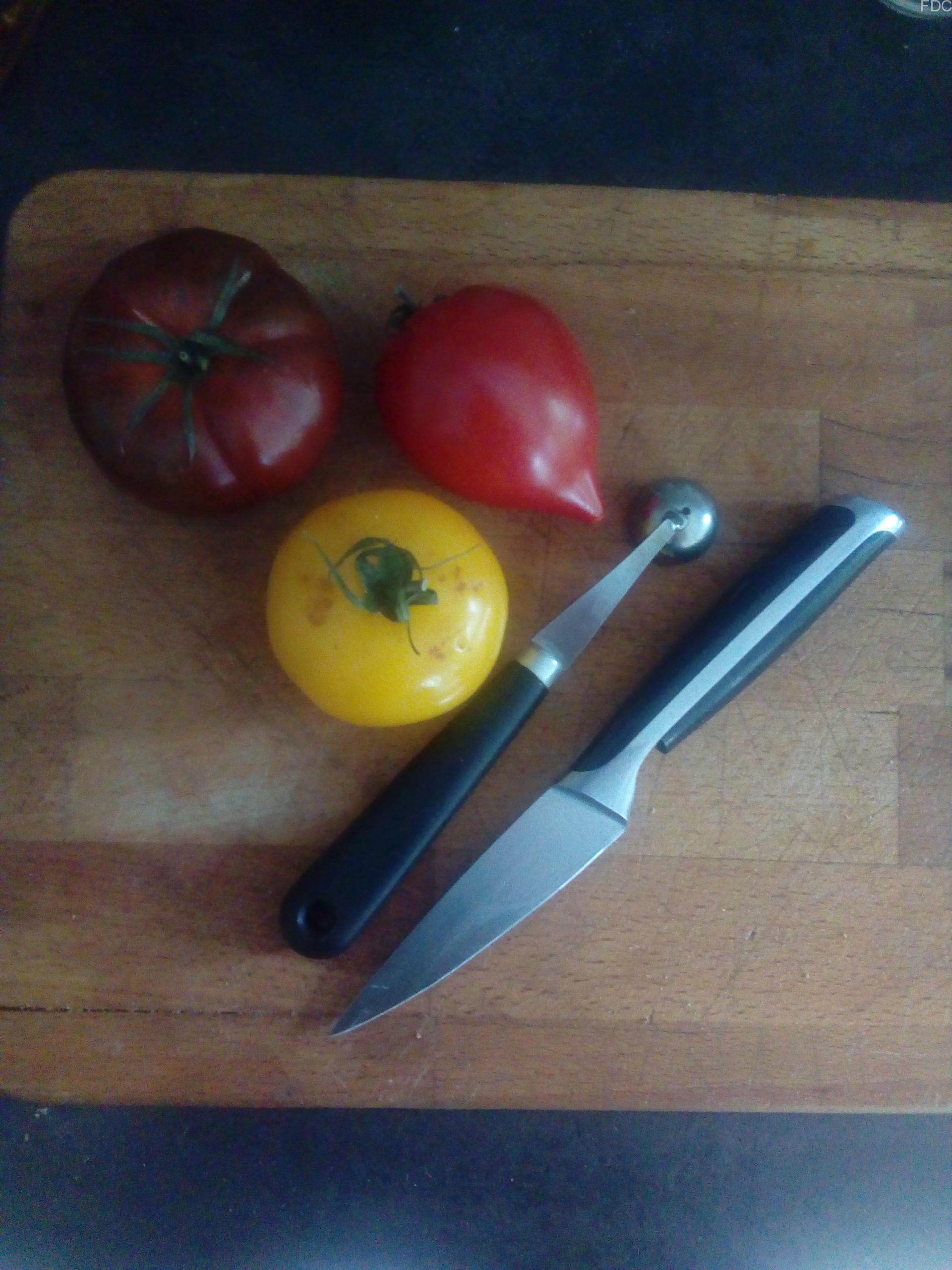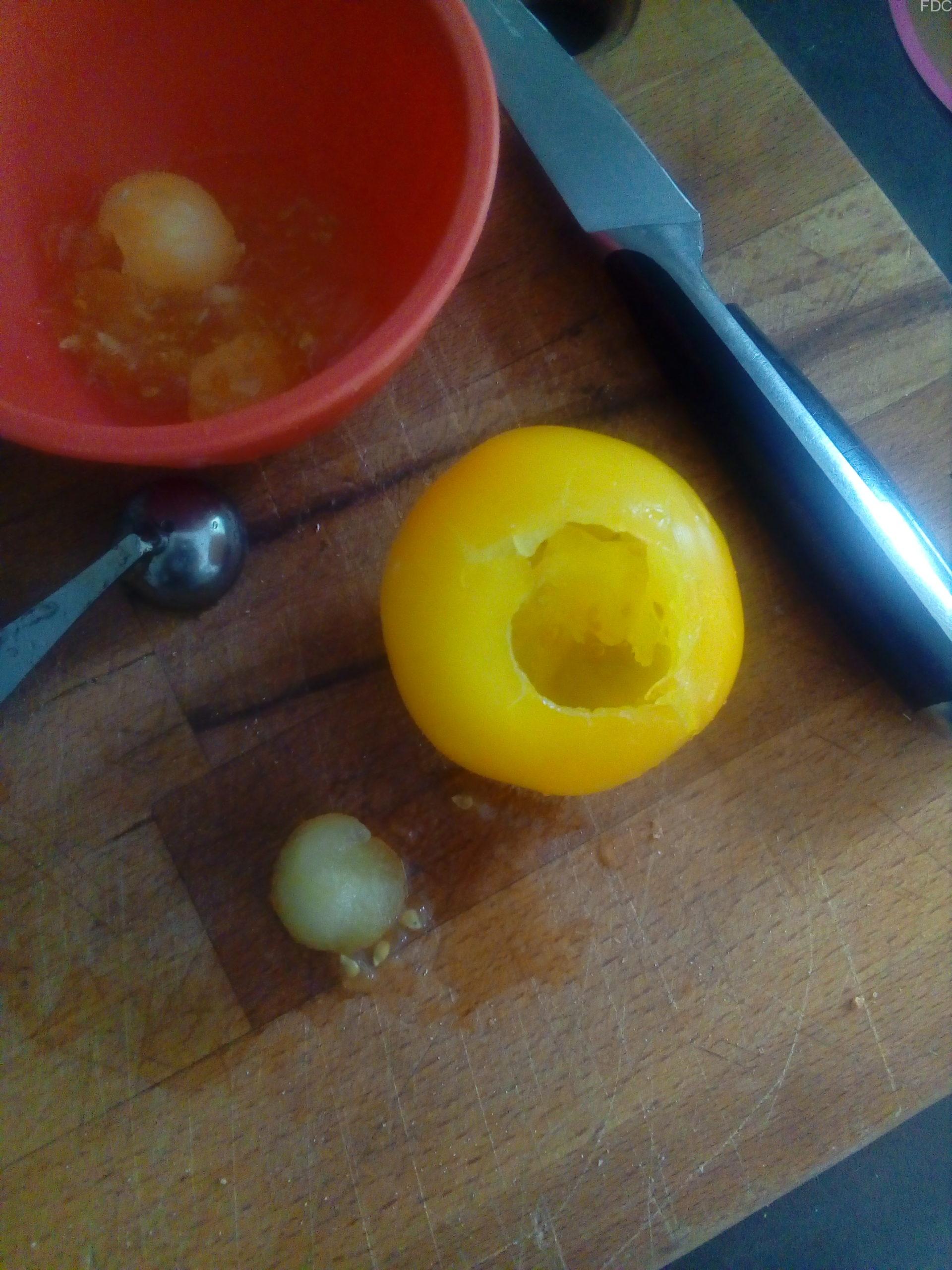 Tomates : Prenez vos tomates et incisez un côté (si oblongue) ou l’opposé du pédoncule. Avec une cuillère à pomme noisette faites délicatement un petit trou (capuchon) et vider l’intérieur (gardez le pour cuire les asperges).
