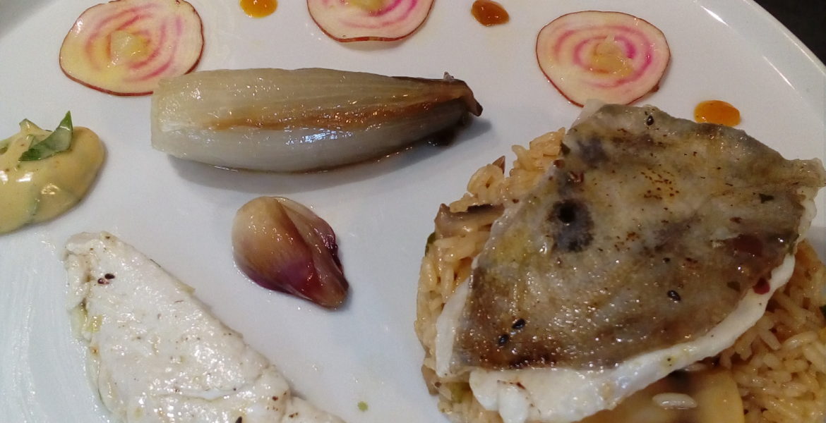 Les légumes, j’ai choisi l’endive de terre, petite mais très gourmande. Ça n’a rien à voir avec celle que vous trouvez en sachet, pleine d’eau et sans saveur. L’échalote grise, quel régal ! Et la betterave Chiogga crue en carpaccio (même marinade que le poisson).