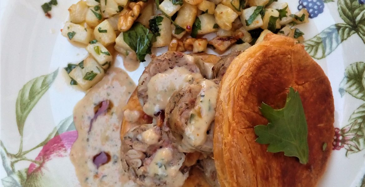 Feuilleté d'andouillette de canard aux coings( compoté) , céleri rave rissolés aux noix à la graisse de canard.
