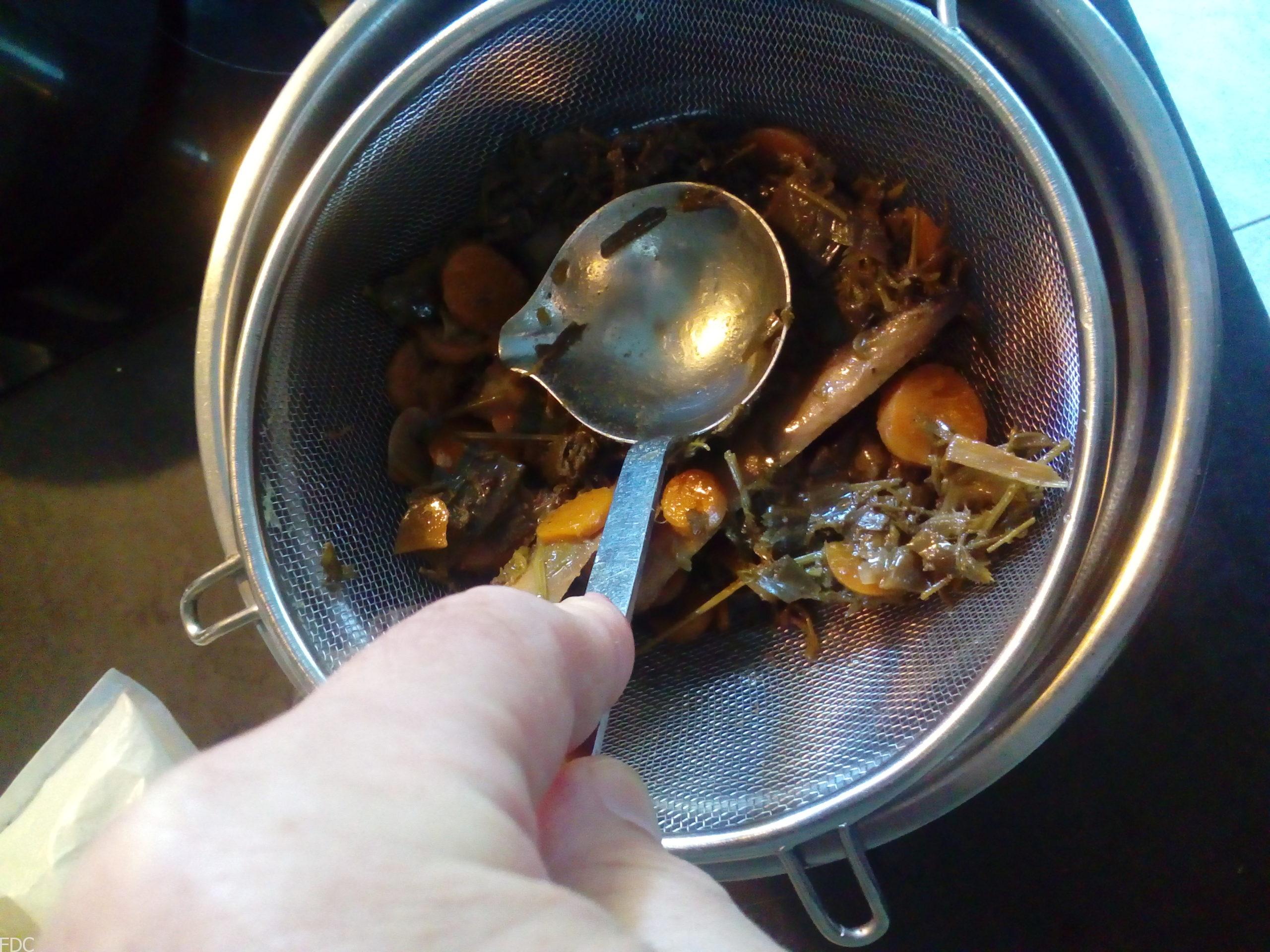 Laissez refroidir votre fond de bœuf un peu pour infuser. Passez au chinois en foulant légèrement avec une petite louche.