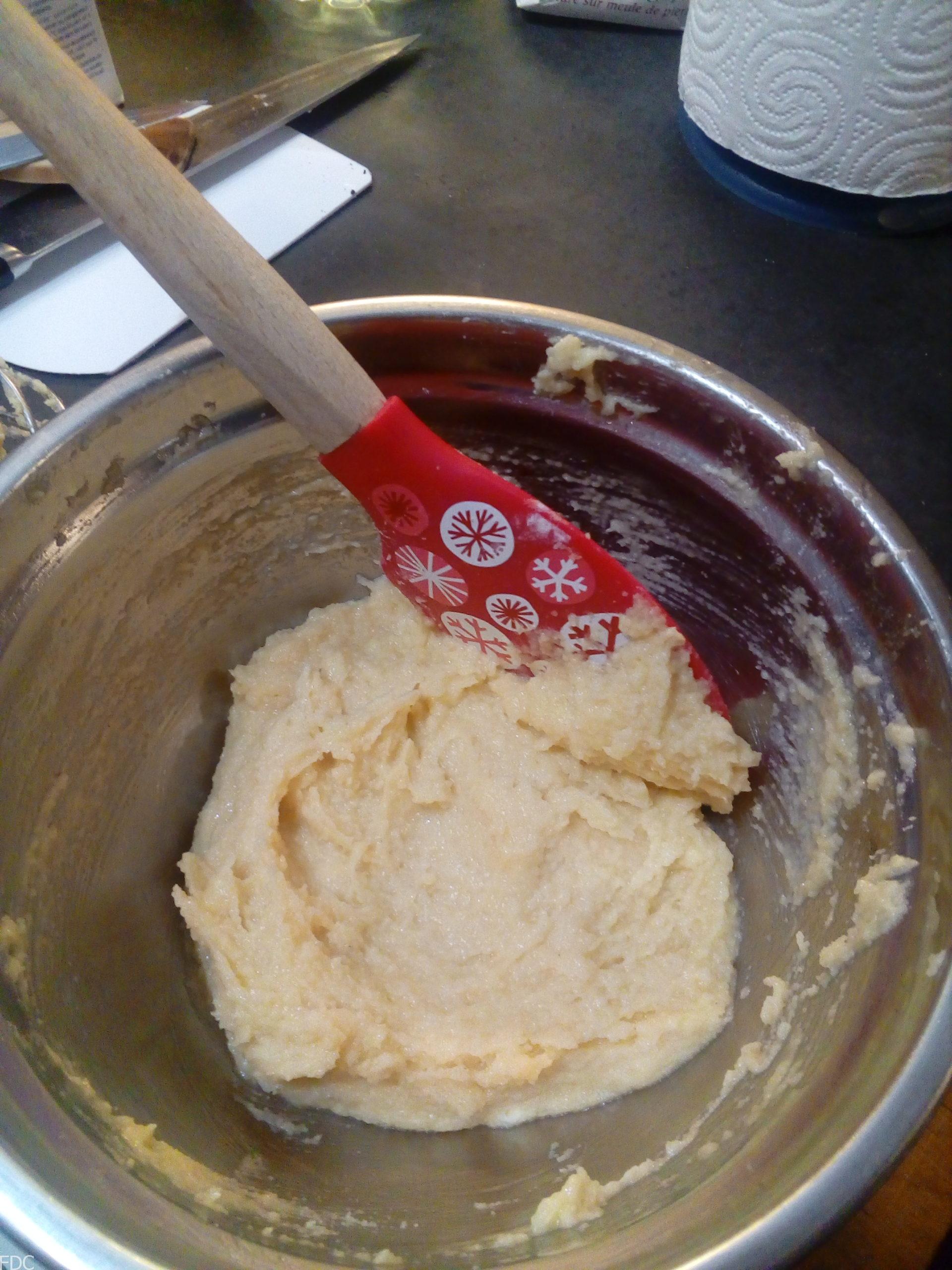 Dans un saladier mélangez la poudre d’amande et le sucre glace, ajoutez le beurre ramolli et l’alcool.