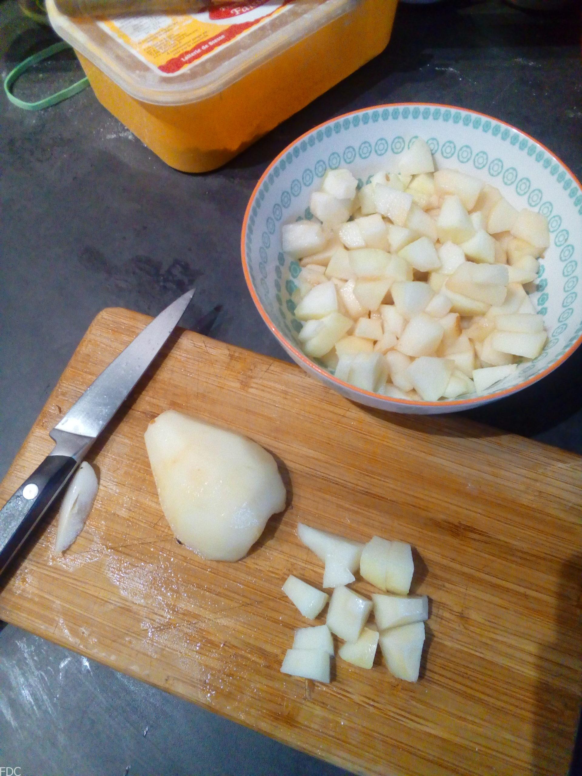 Epluchez et taillez en gros cubes vos trois poires.