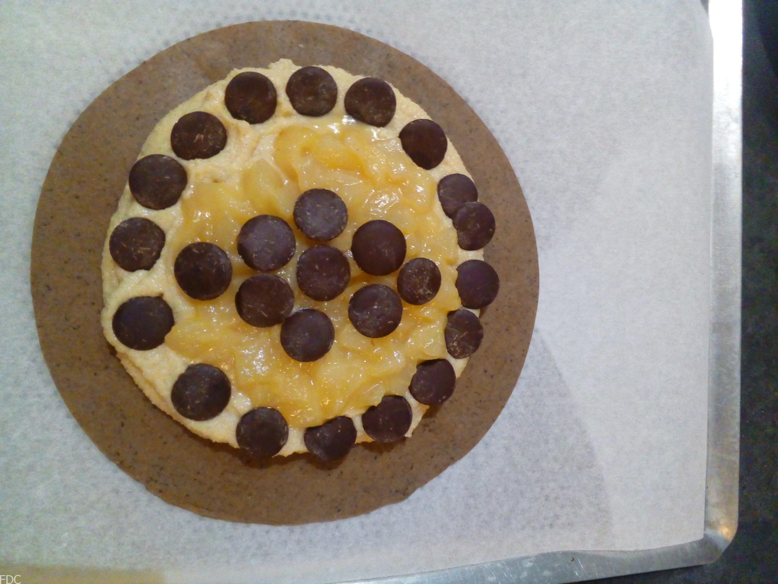 Garnissez de la frangipane à la poche à douille ou à la spatule sur un cm d’épaisseur environ en laissant 3 cm entre la crème et le bord. Ajoutez les poires du centre jusqu’à un cm du bord de la crème et ajoutez les pistoles de chocolat.