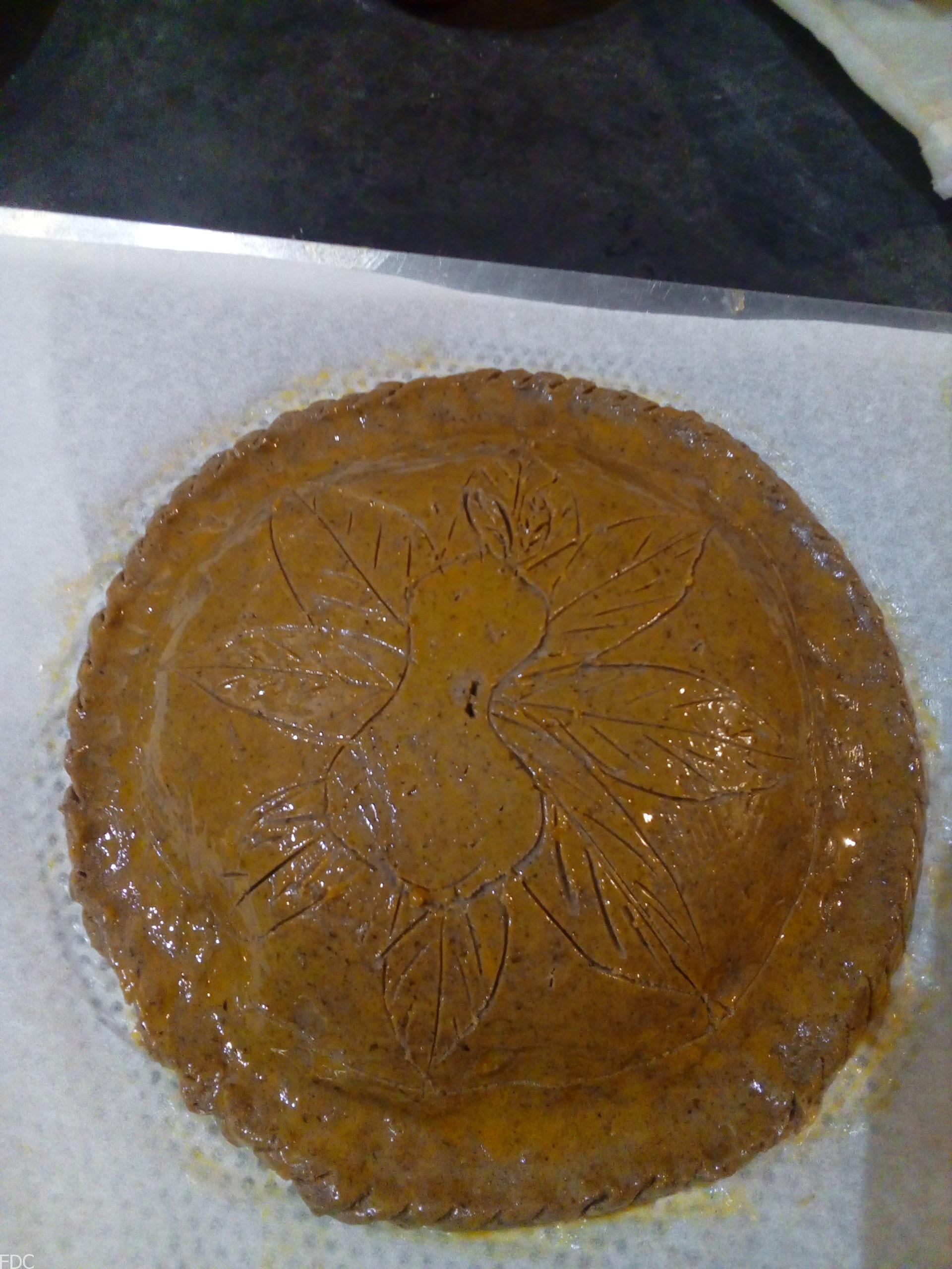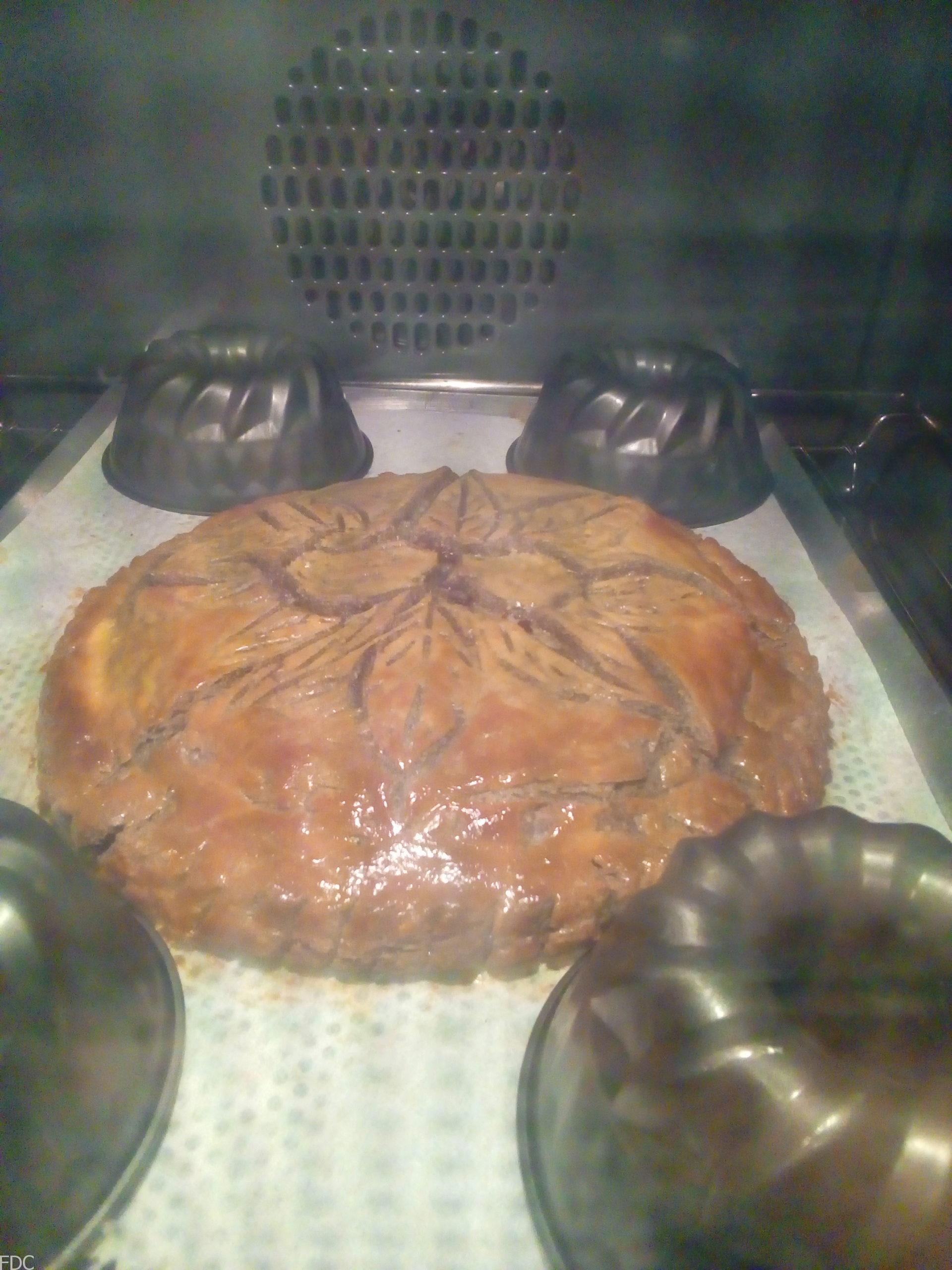Normalement on retourne la galette avant de la dorer. Mais la pâte étant plus fragile, je ne l’ai pas fait. Au cas où prenez une deuxième plaque avec une feuille de papier, posez-la à l’envers et retournez la galette.