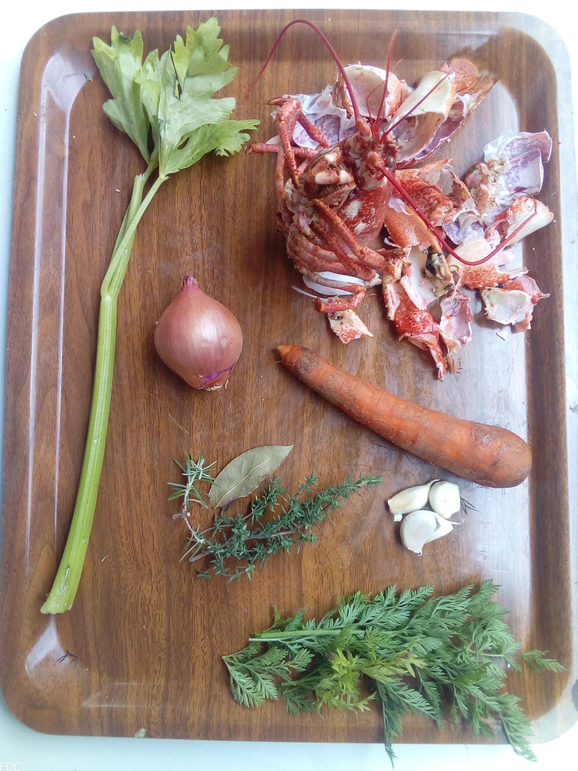 Pour réaliser le fumet de homard, vous aurez besoin d’une garniture aromatique que vous taillerez grossièrement mais régulière. Oignon, 3 gousses d’ail, les deux branches de céleris (gardez les feuilles à part).1 bouquet garni plus celui de la cuisson du homard, 5 grains de poivre.