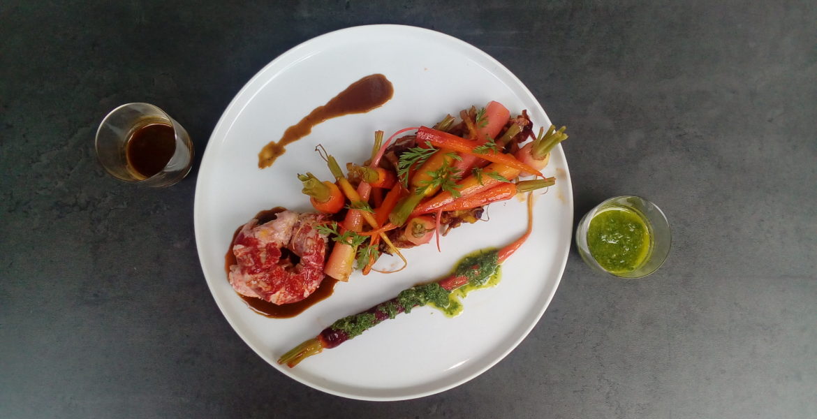 Le homard et son jardin de carottes est plat qui peut paraître complexe mais il est en fait réalisé à partir de deux ingrédients principaux seulement. Le homard et une botte de carotte de couleurs.