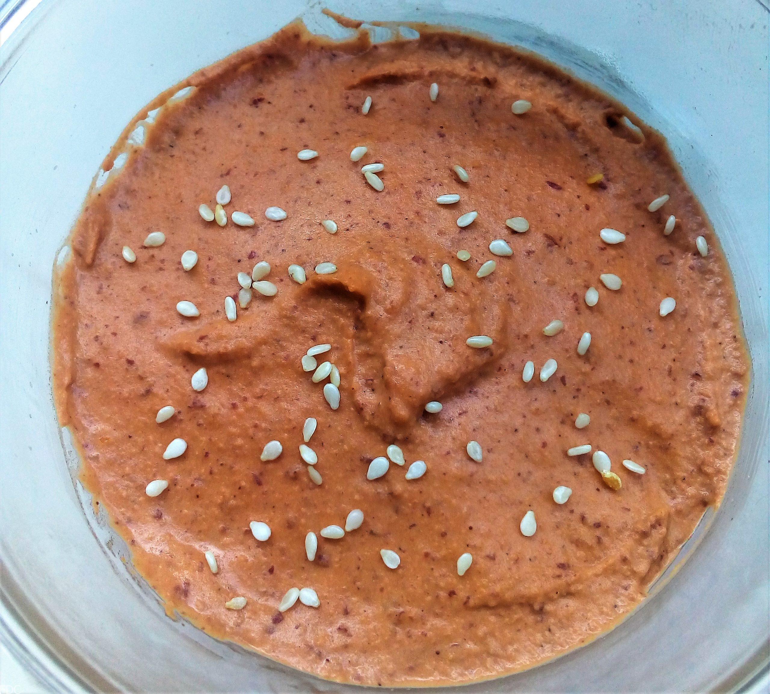 Une fois terminé votre Houmous de haricots rouges à l’harissa, versez dans votre récipient de service, lissez et ajoutez les graines de sésame. Un filet d’huile (nature, paprika ou harissa) et facultatif de la coriandre fraîche haché au moment de servir. Réservez au frais.