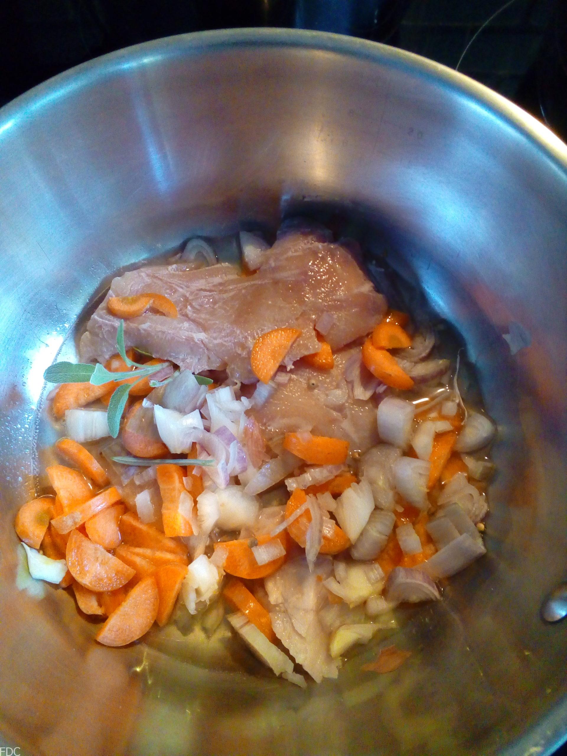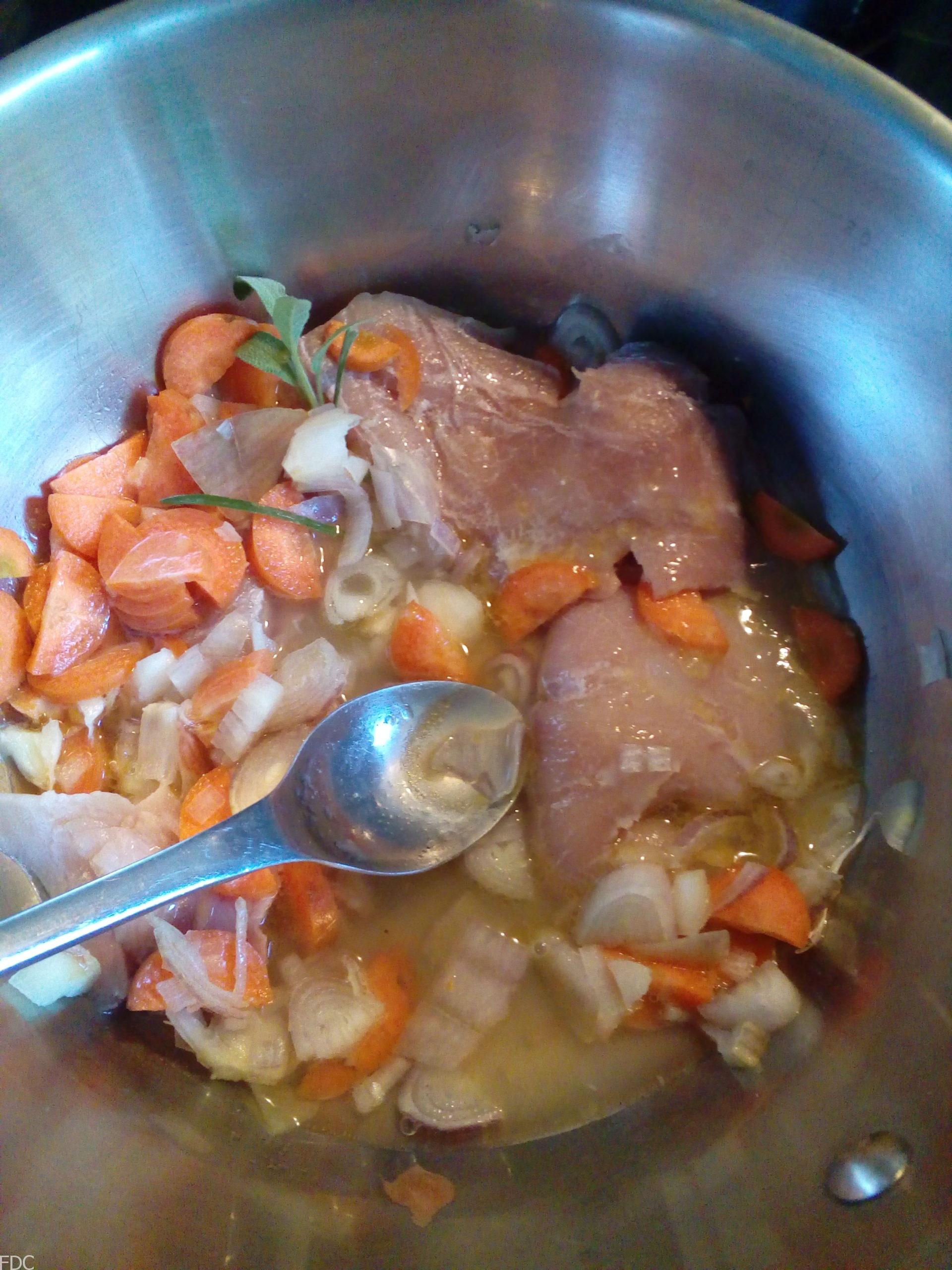 Dans une casserole, mettez la carotte, l’oignon, les couennes coupées en morceaux et les morceaux de jambon pas trop présentable. Vous pouvez aussi demander un os de porc à votre charcutier ou boucher. Faites suer le tout et ajoutez le vin blanc portez à ébullition 2 minutes et ajoutez 40 cl d’eau.