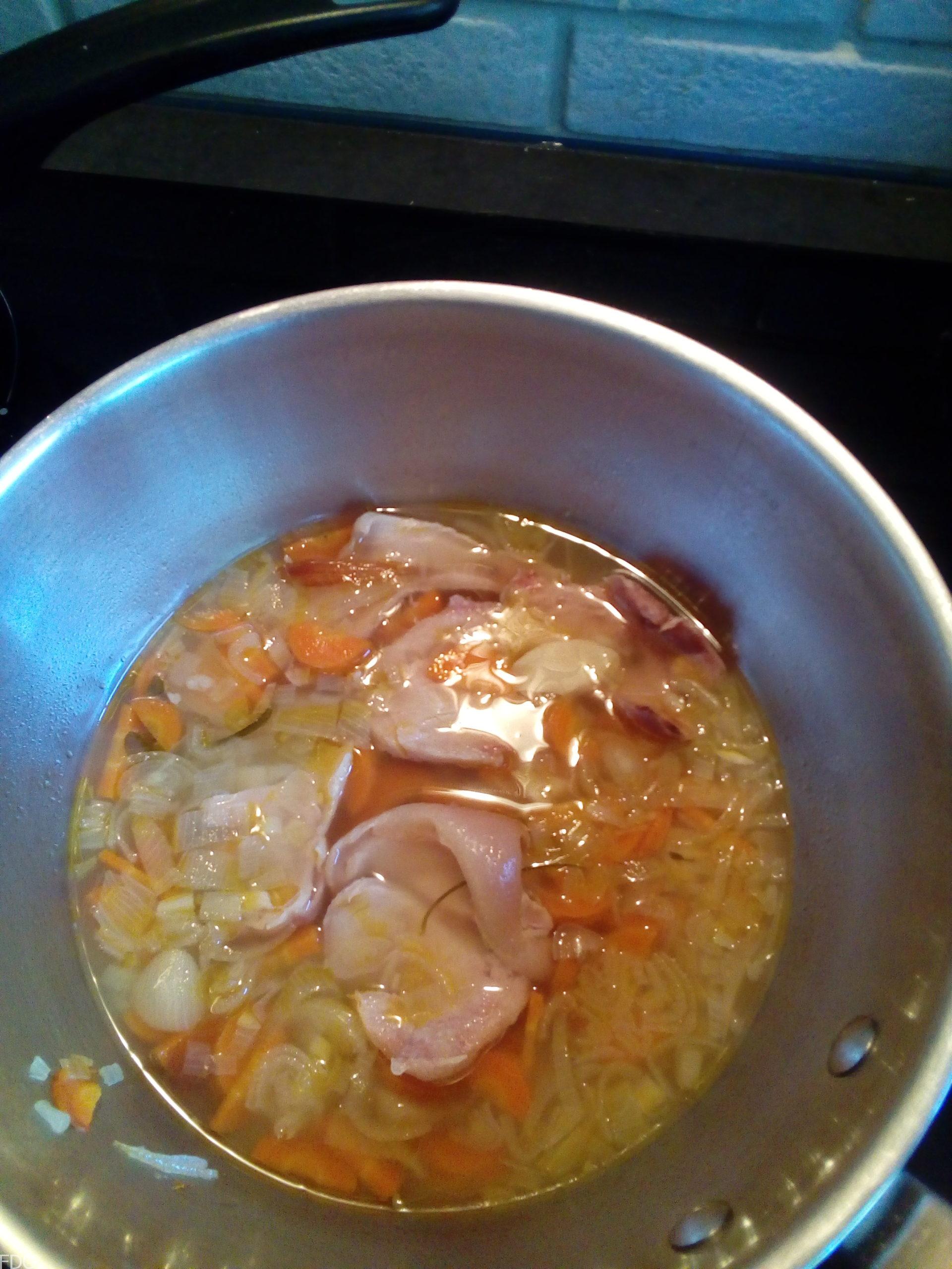 Une fois votre bouillon réalisé vous le mettez à refroidir en y ajoutant les morceaux de jambon à infuser durant deux heures. Le jambon va donner du goût et il va prendre du moelleux.
