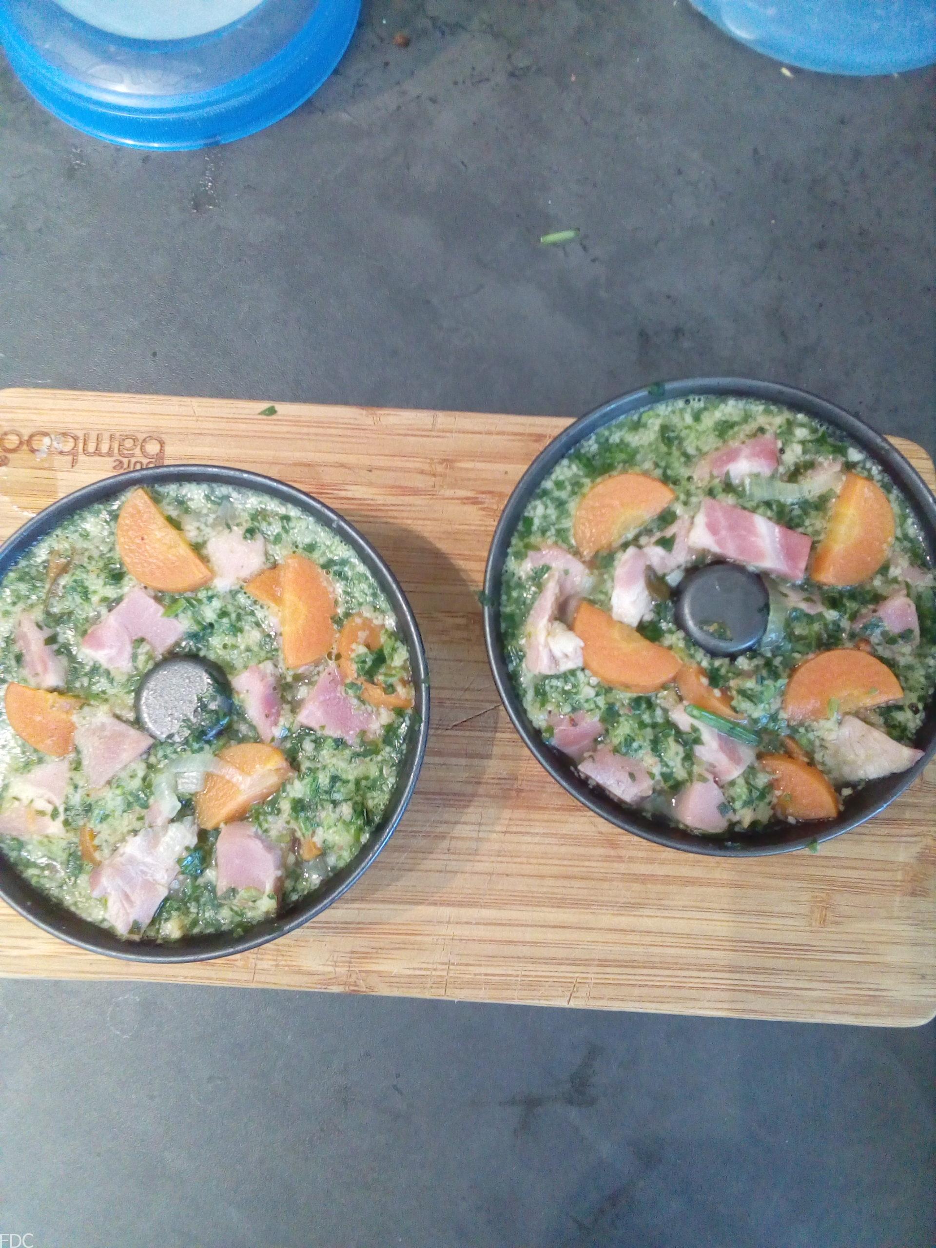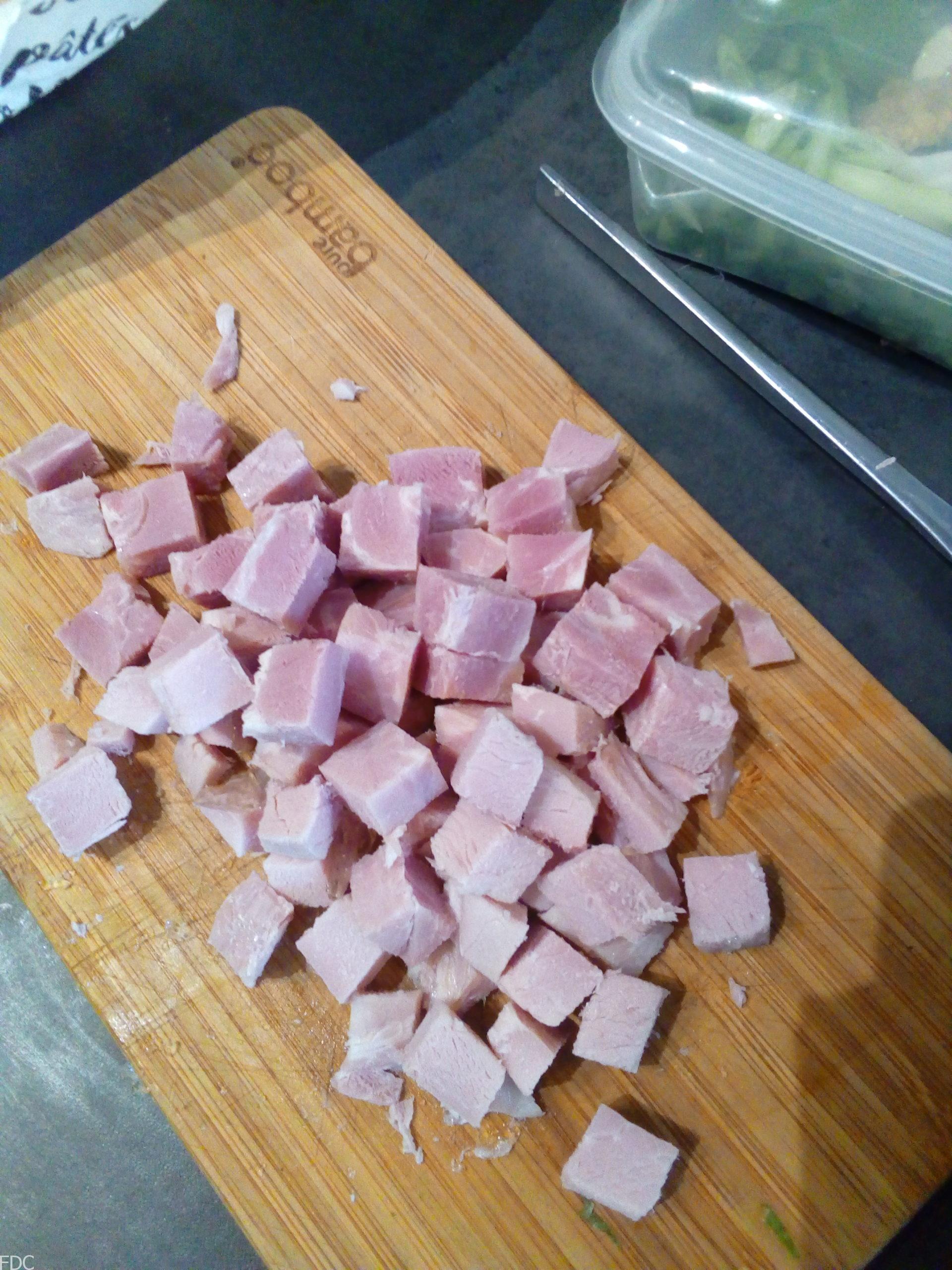 Pendant ce temps, coupez le jambon en dé de 1 cm environ, peu importe la régularité. La taille dépendra du moule (individuel ou plus gros). La taille annoncée et en fonction de mes moules. Mais vous pouvez faire en plus grand dans un saladier par exemple. Dans ce cas le jambon sera en plus gros morceaux.