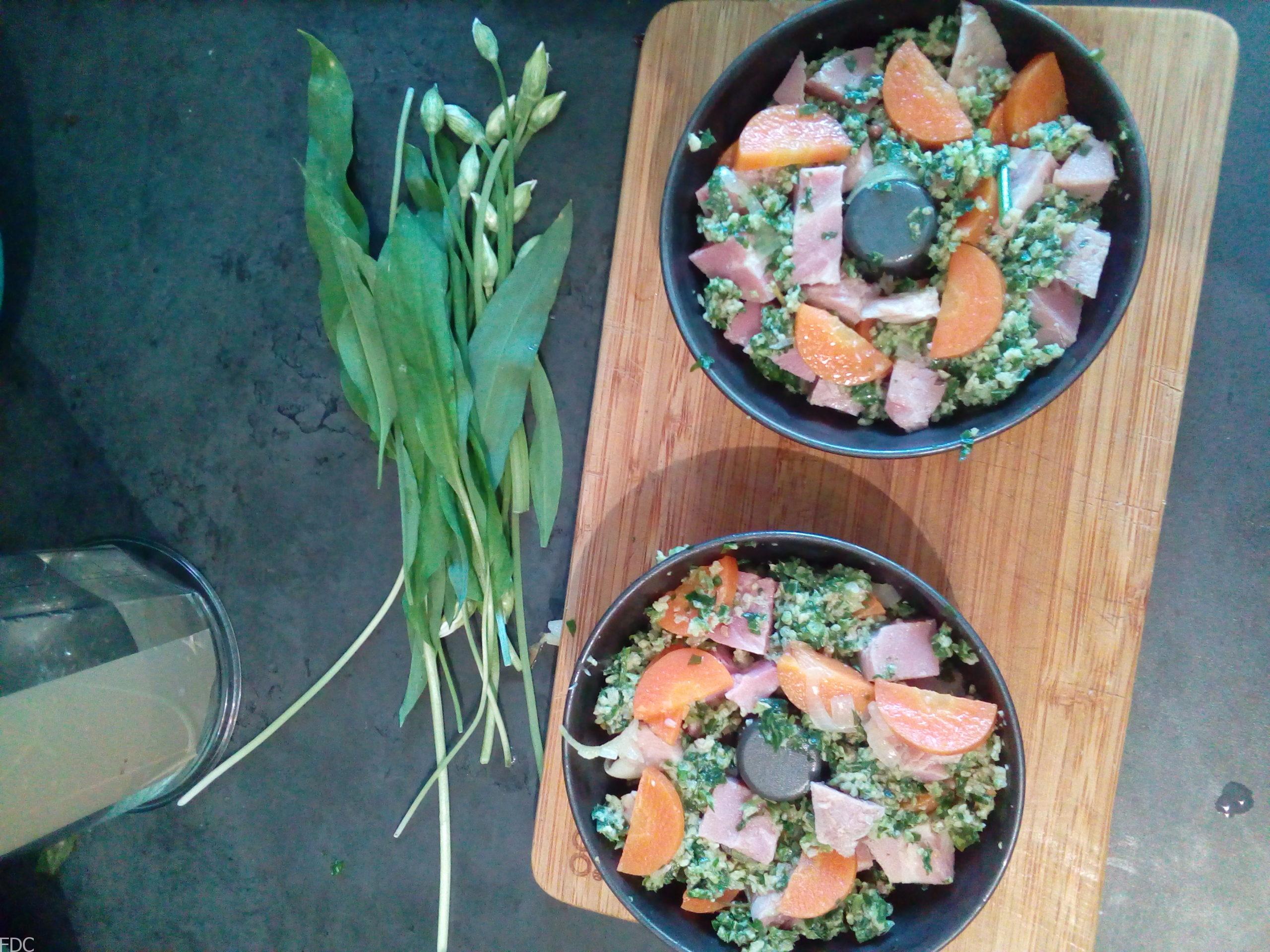 Dans un robot coupe, mettez les feuilles d’ail des ours, La couenne de jambon et mixez le tout de manière très hachés. Pas de gros morceaux.