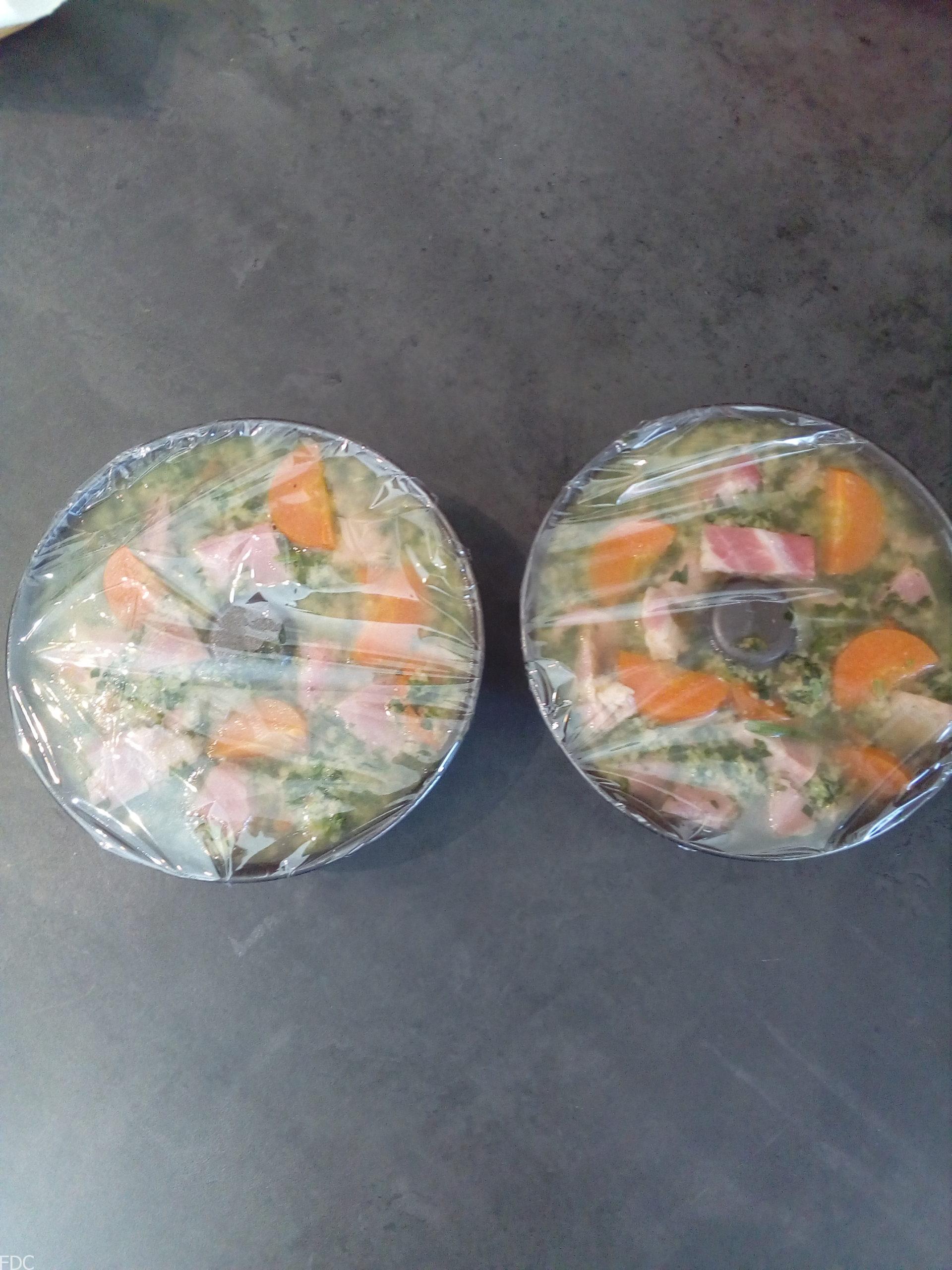 Mettez une couche nappante de persillade et couvrez des dés de jambons. Bouchez les espaces de persillade et répétez l’opération jusqu’au ras. Vous pouvez y glisser quelques morceaux de carottes cuites dans le bouillon pour la couleur et le goût.