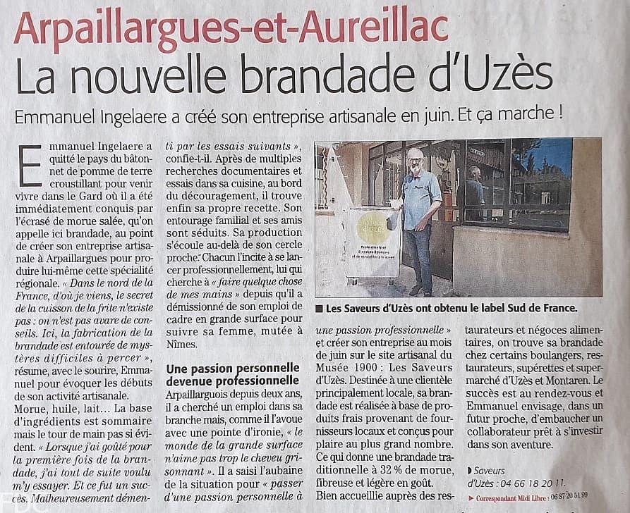Une véritable découverte car Saveurs d’Uzès a un an d’existence à peine. Spécialisé dans la fabrication artisanale de la fameuse Brandade de Morue, Emmanuel Ingelaere, originaire du Nord de la France, est comme beaucoup et comme moi tombé amoureux de ce petit coin de Paradis. Mais quoi faire quand on a démissionné de son emploi de Cadre pour suivre son épouse mutée dans la région ?