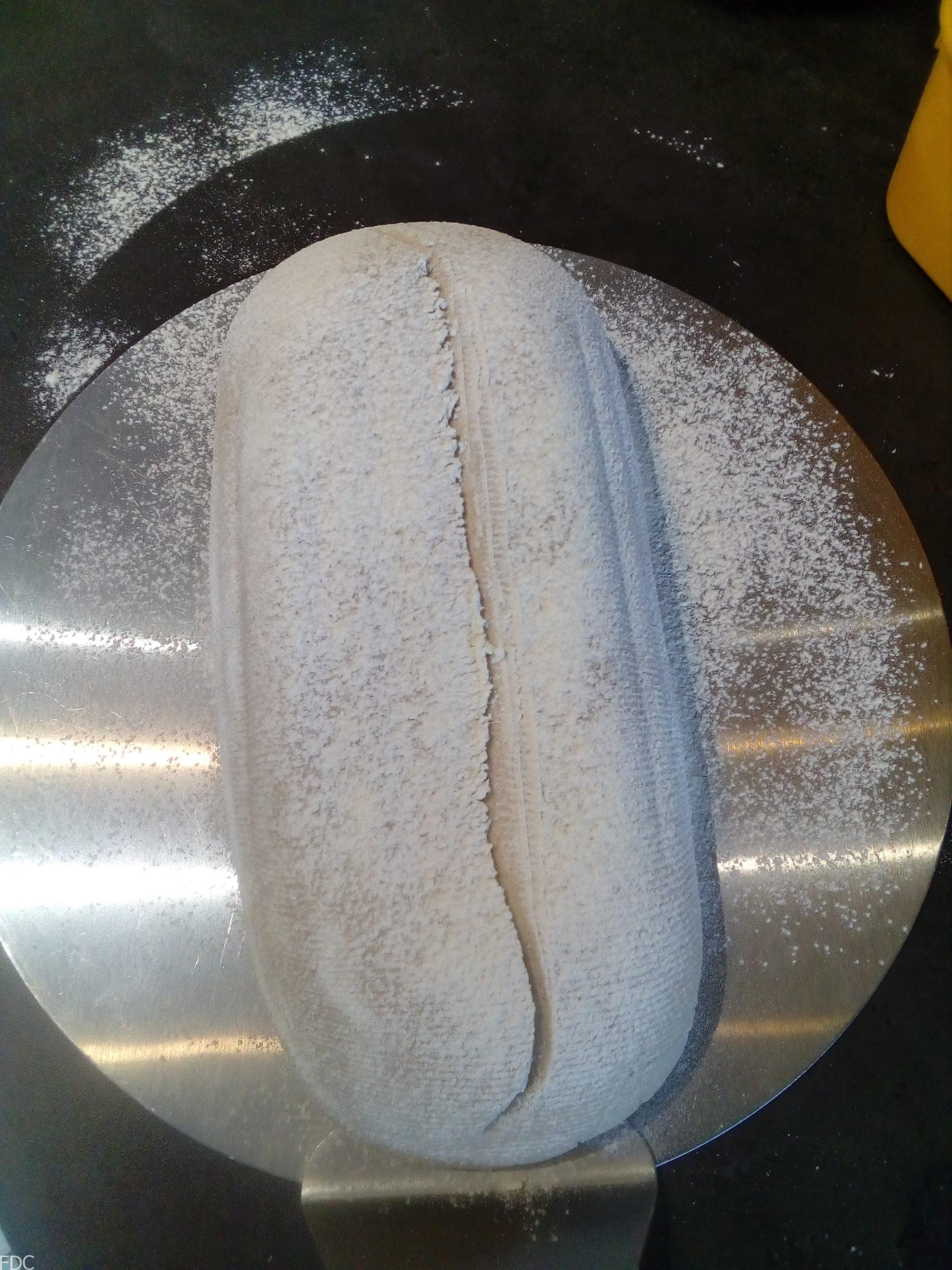 Formez un rectangle large vertical sans écraser votre pâte pour conserver les gaz emprisonnés. Et replier en deux vers le haut, enlevez l’excédent de farine, prenez la pâte au niveau de la pliure et donner un quart de tour en la soulevant et répéter l’opération. Si votre pâte se tient bien cela devrait suffire. Trop pétrir aura un effet néfaste tout autant qu’un manque de pétrissage. C’est là qu’intervient le ressenti. Savoir si c’est bien ou pas. La chance du débutant peut servir mais il faut souvent quelques essais avant de trouver la bonne formule.