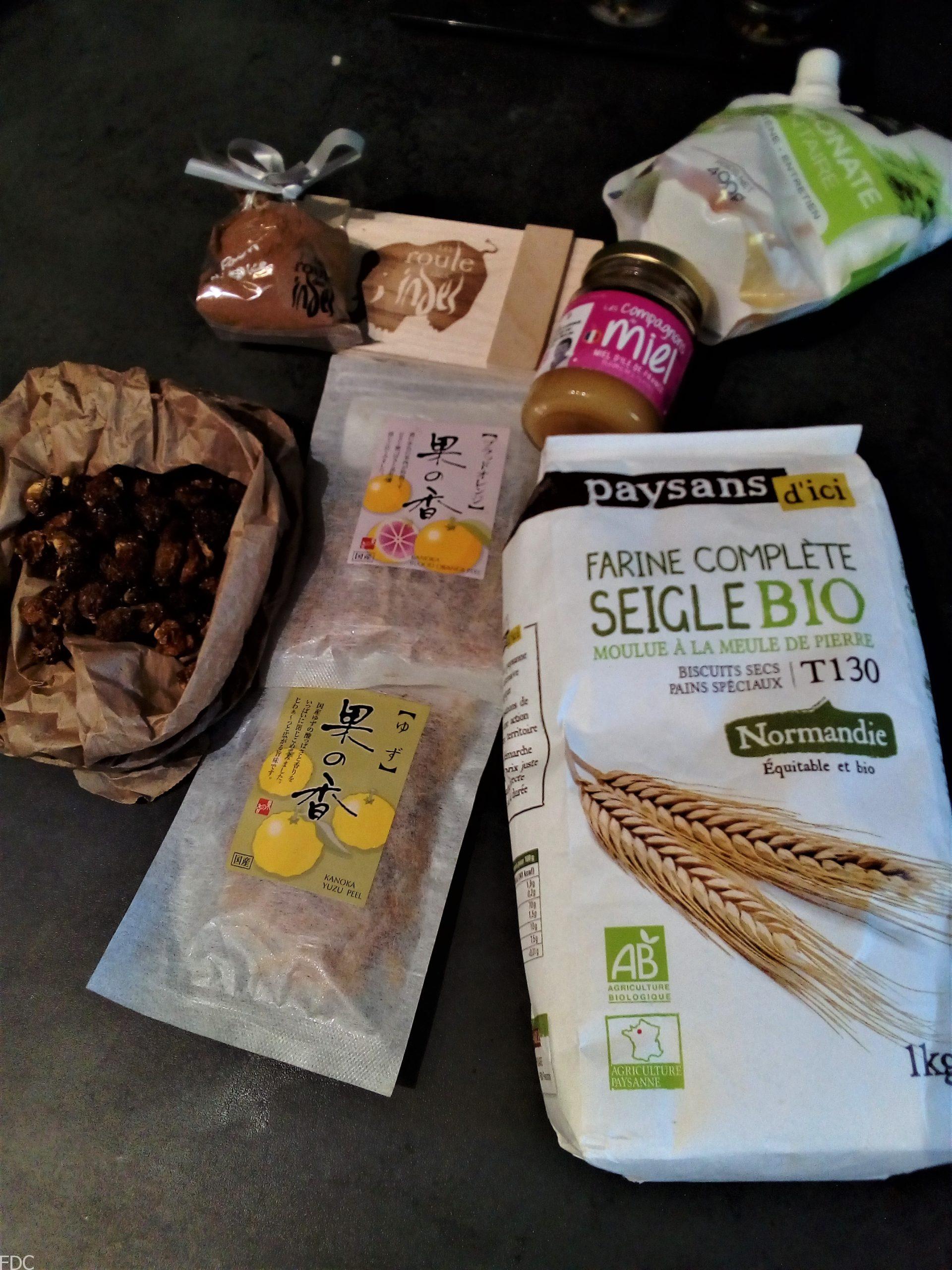 Je suis parti sur la base du Pain d’Epices de Reims qui se réalise avec de la farine de Seigle mais j’ai remplacé l’eau par du lait d’amande non sucré et j’y ai mis du yuzu confit, orange sanguine confite et physalis séchés.