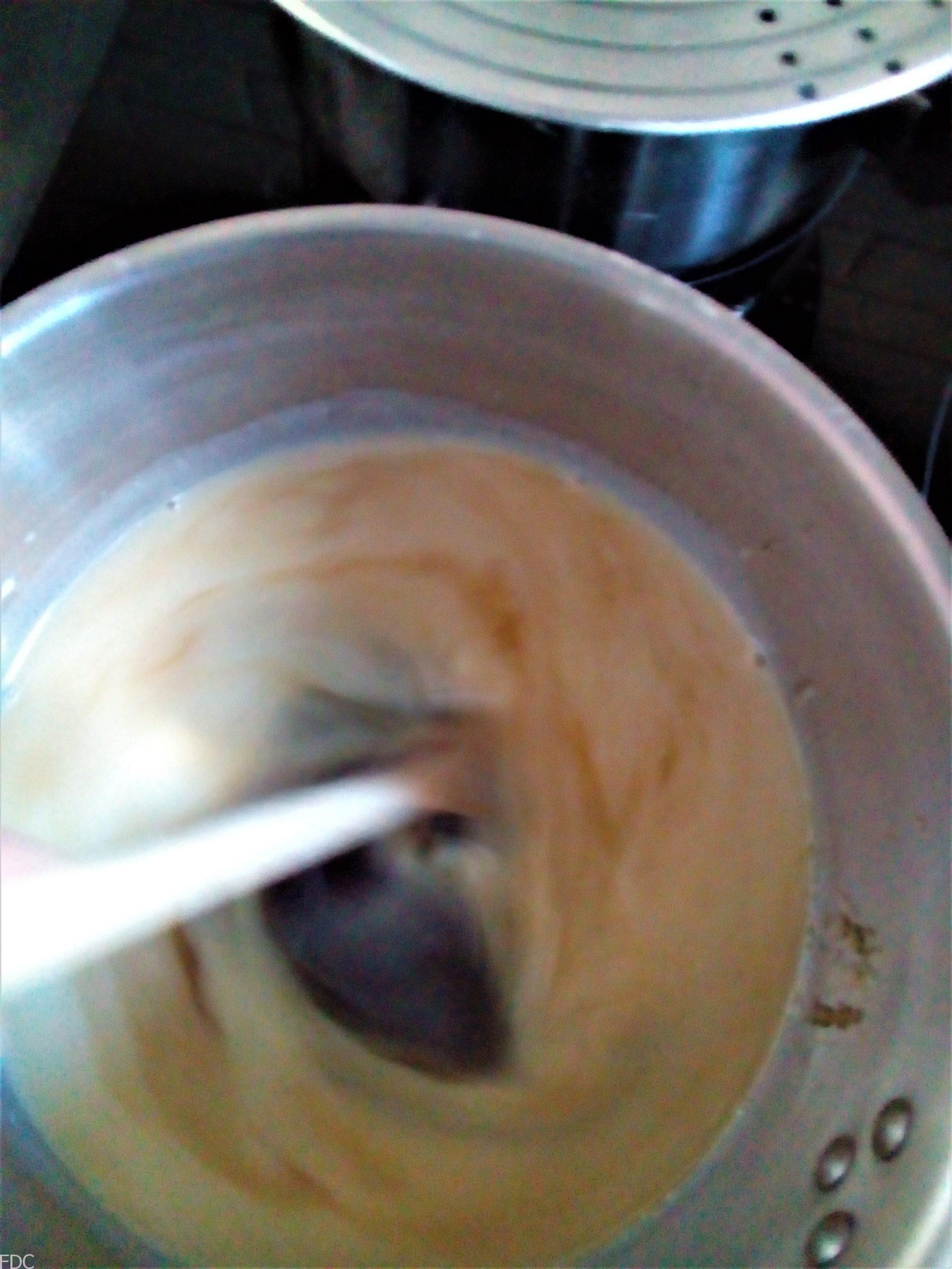 Dans une casserole mettez-y le lait d’amande et le miel à tiédir. Mélangez pour diluer le miel.