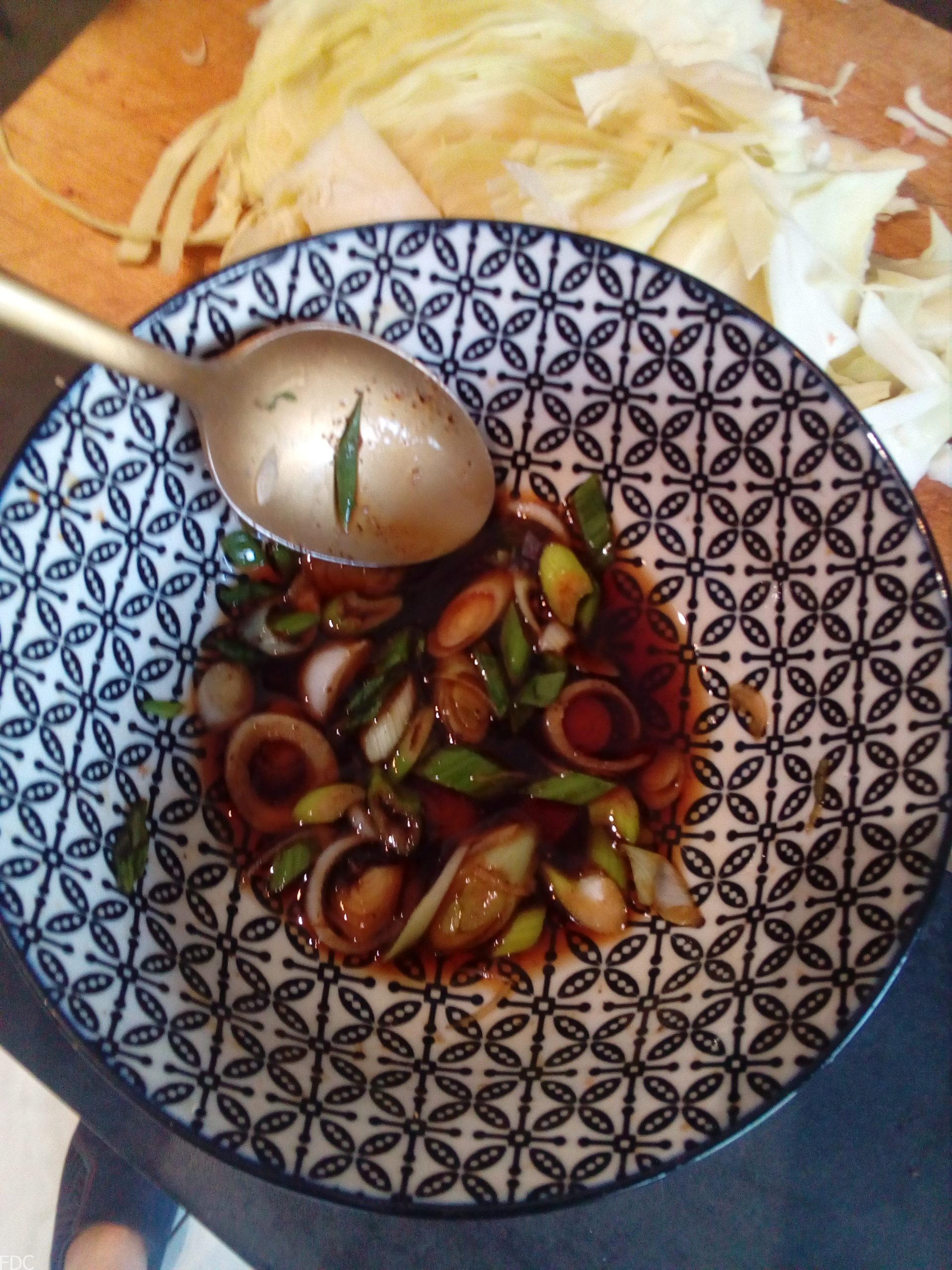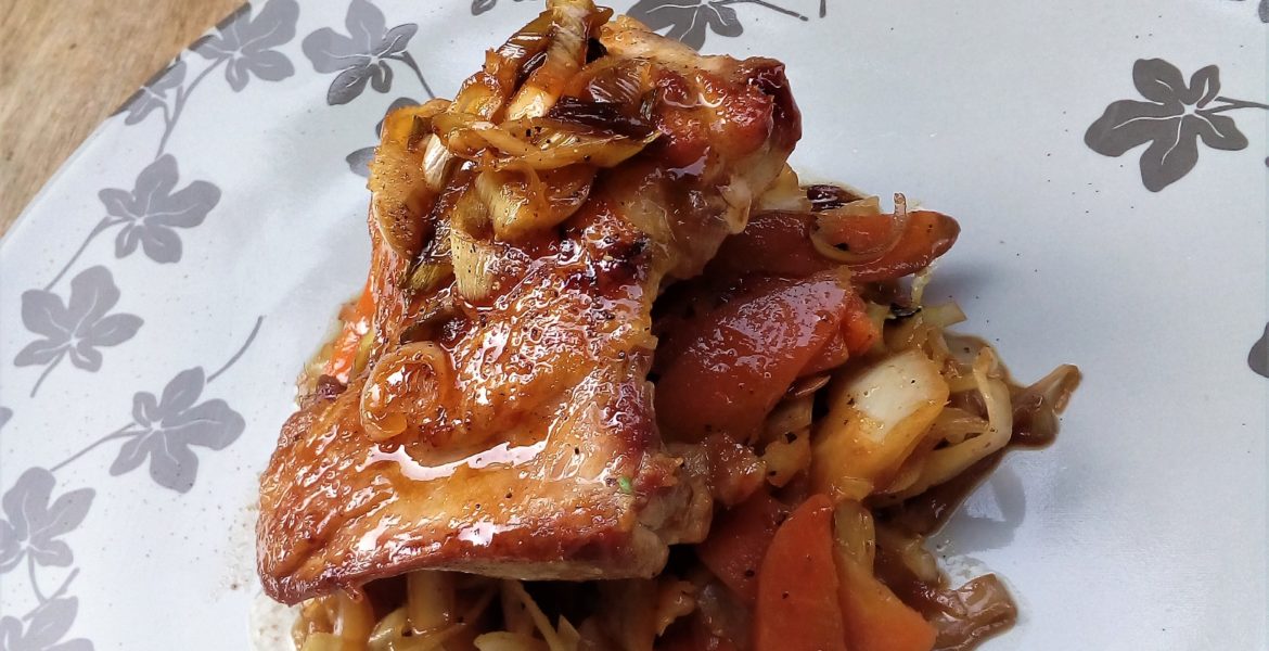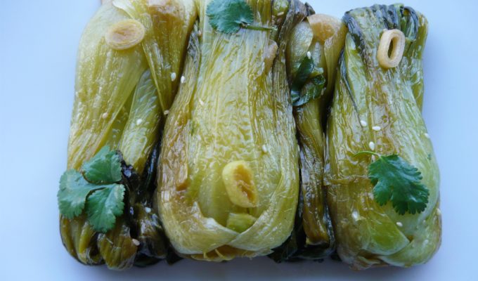 En photo : choux blanc braisé au bouillon court de poulet à la citronnelle réalisé avec les os des cuisses. Zéro déchet.
