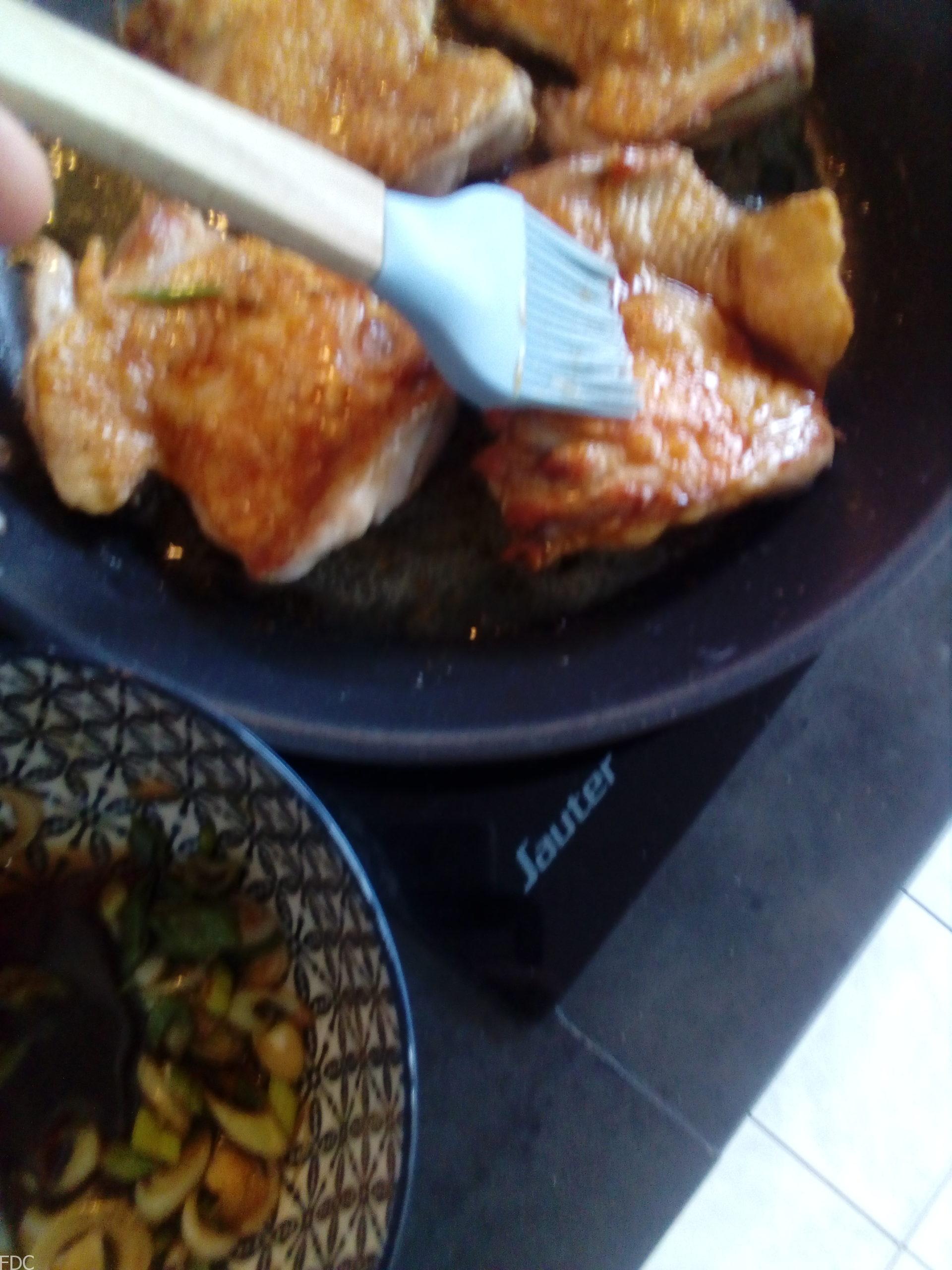 En fin de cuisson badigeonnez avec la sauce vos cuisses de tous côtés.