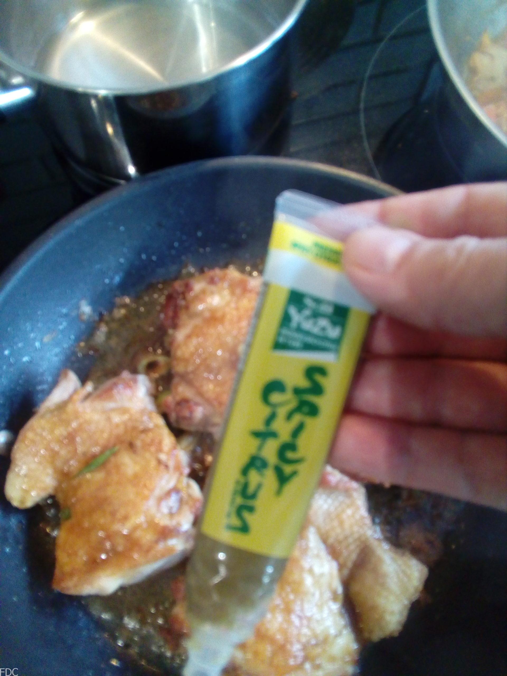 Pendant ce temps avec un pinceau badigeonnez la peau des poulets de Yuzu Kocho et laissez sécher.