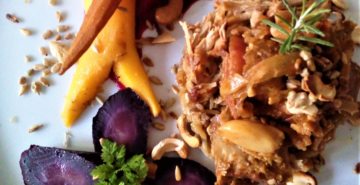 Le Pulled porc aux noix de cajou est mijoté en cocotte. J’y ai mis des noix de cajou, des graines de tournesol et du gingembre entre autres pour apporter de l’onctuosité au jus d’une cuisson longue de 3 h. J’ai choisi une palette roulée et un morceau de lard gras. La palette roulée pour une cuisson lente et moelleuse à cœur apporté par le gras naturel du lard frais.