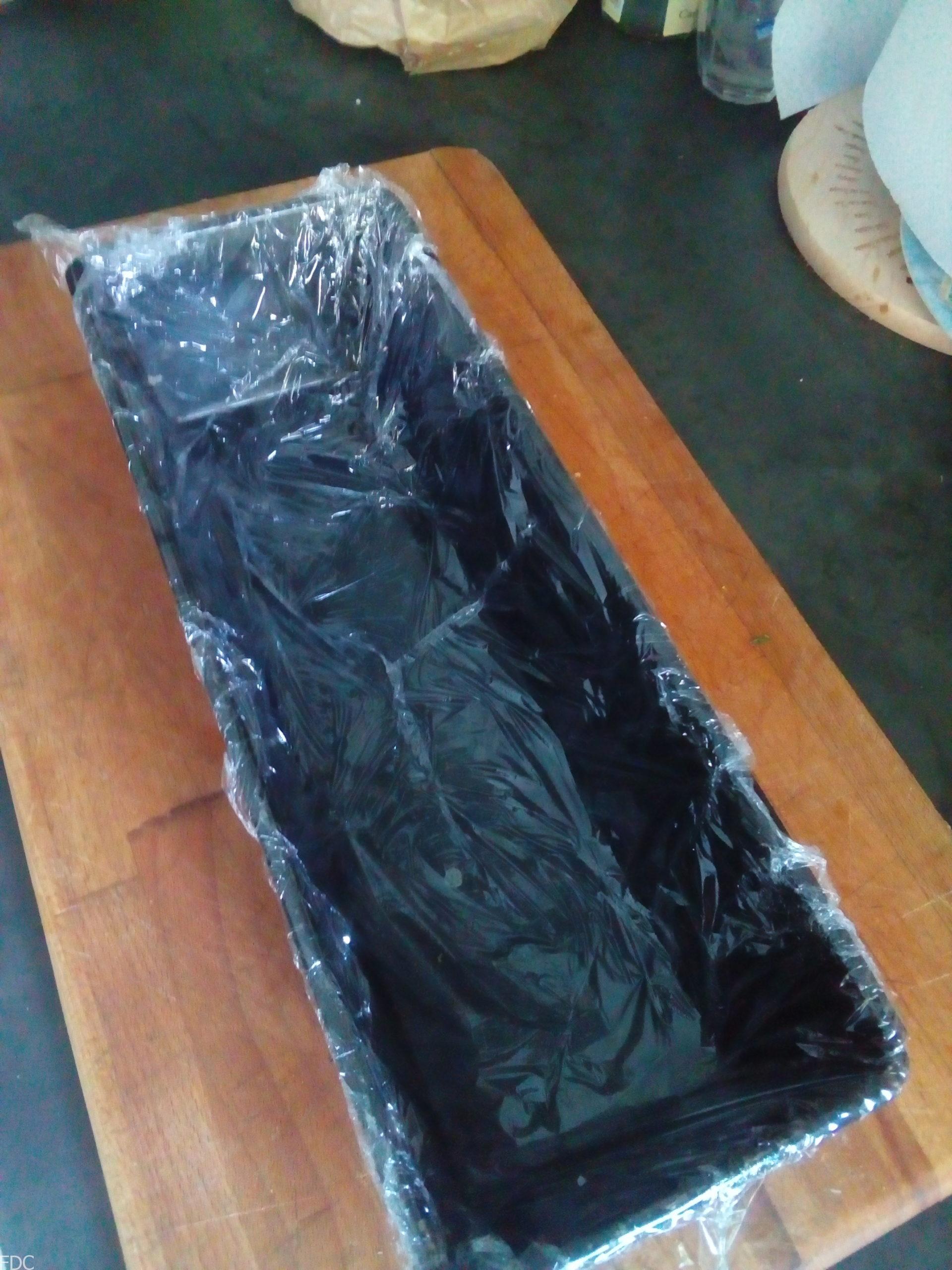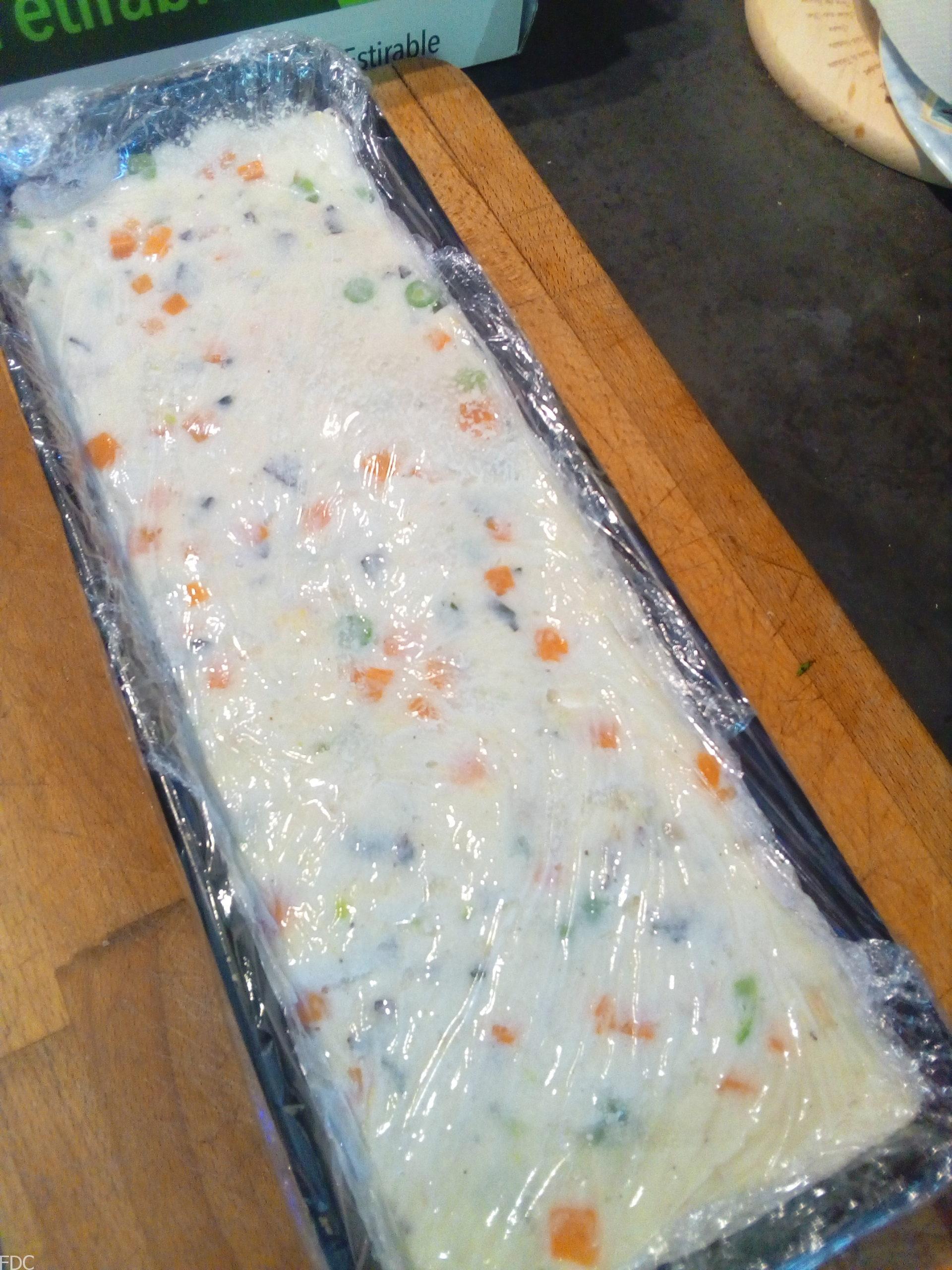 Mettre un film alimentaire au fond et côtés du moule à cake.