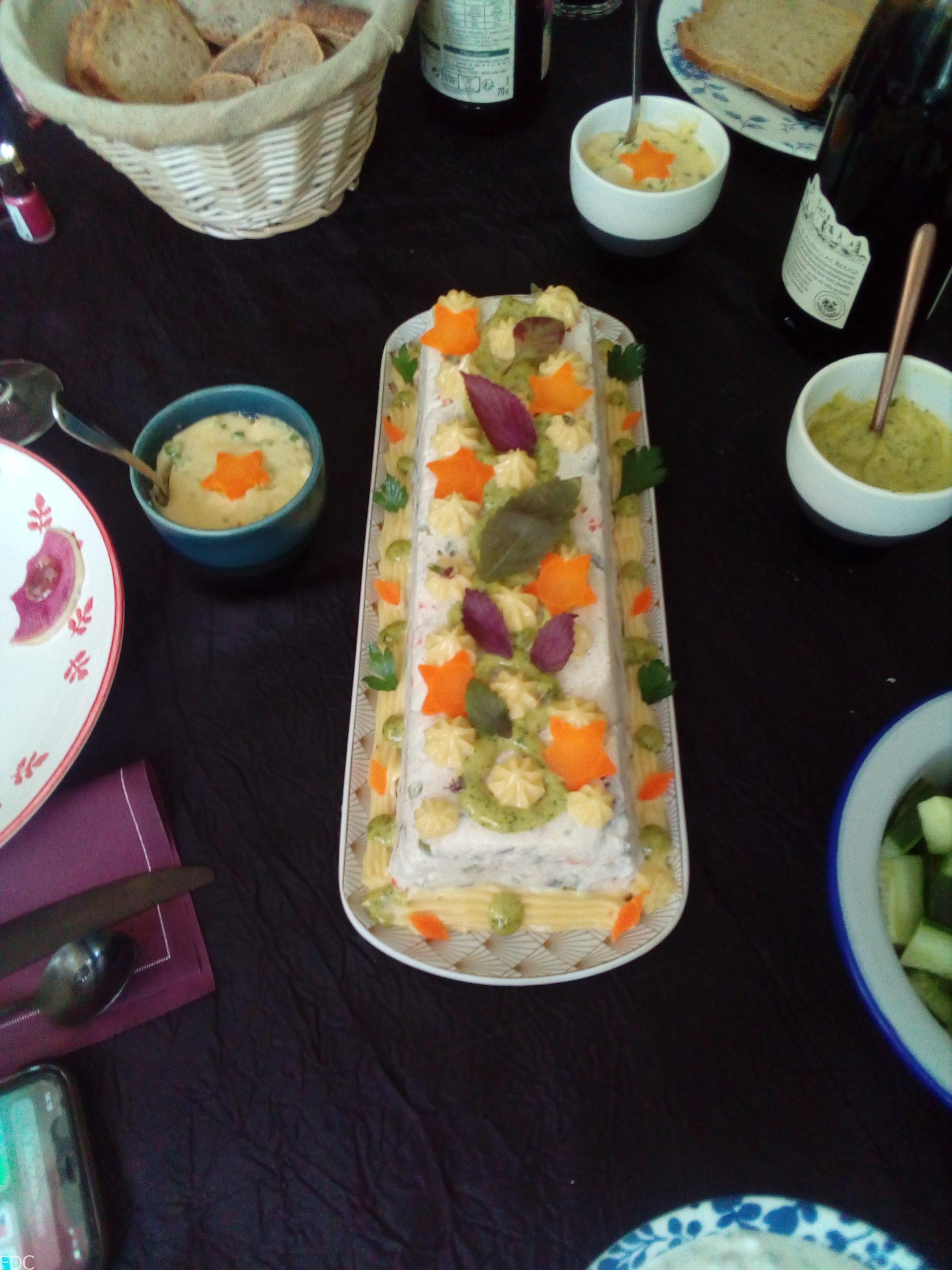 Saumon fumé : mettre le saumon fumé avec 25 g de beurre et une belle cuillère de crème, poivre et citron. Ne salez pas le saumon est déjà salé. Mixez et rectifiez l’assaisonnement si nécessaire. Pour l’utiliser en insert lors du moulage, je forme un boudin avec du film alimentaire. Réservez au frais.