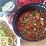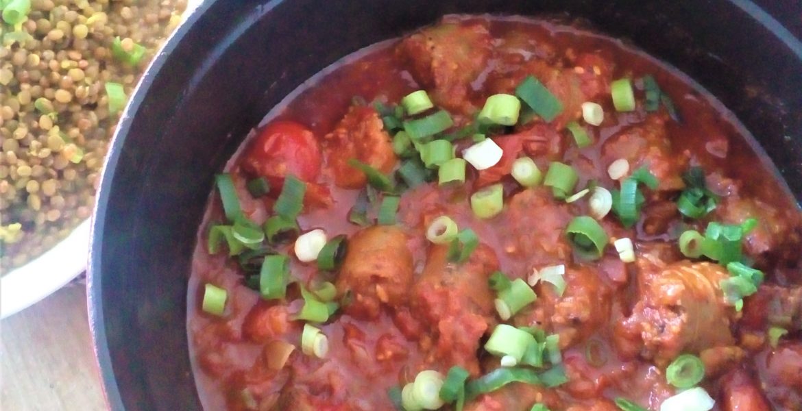 Le Rougail Saucisse s’accompagne traditionnellement de riz blanc et d’un légumineux, haricot, lentilles ou autre. J’ai choisi les lentilles de Cilaos qu’on m’a offert qui est originaire de La Réunion. Mais tout autre lentille verte ou haricot, fera l’affaire.
