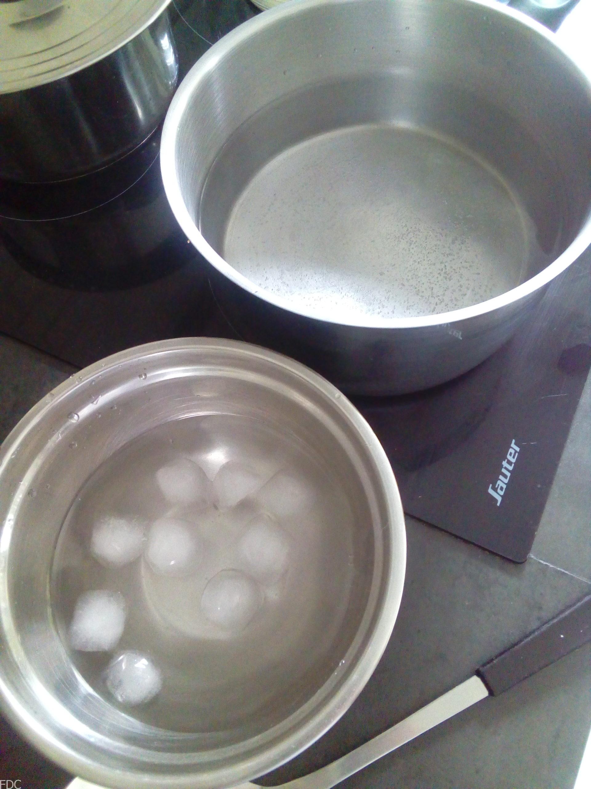 Plongez les dans l’eau avec glaçons pour stoppez la cuisson et décoller la peau.