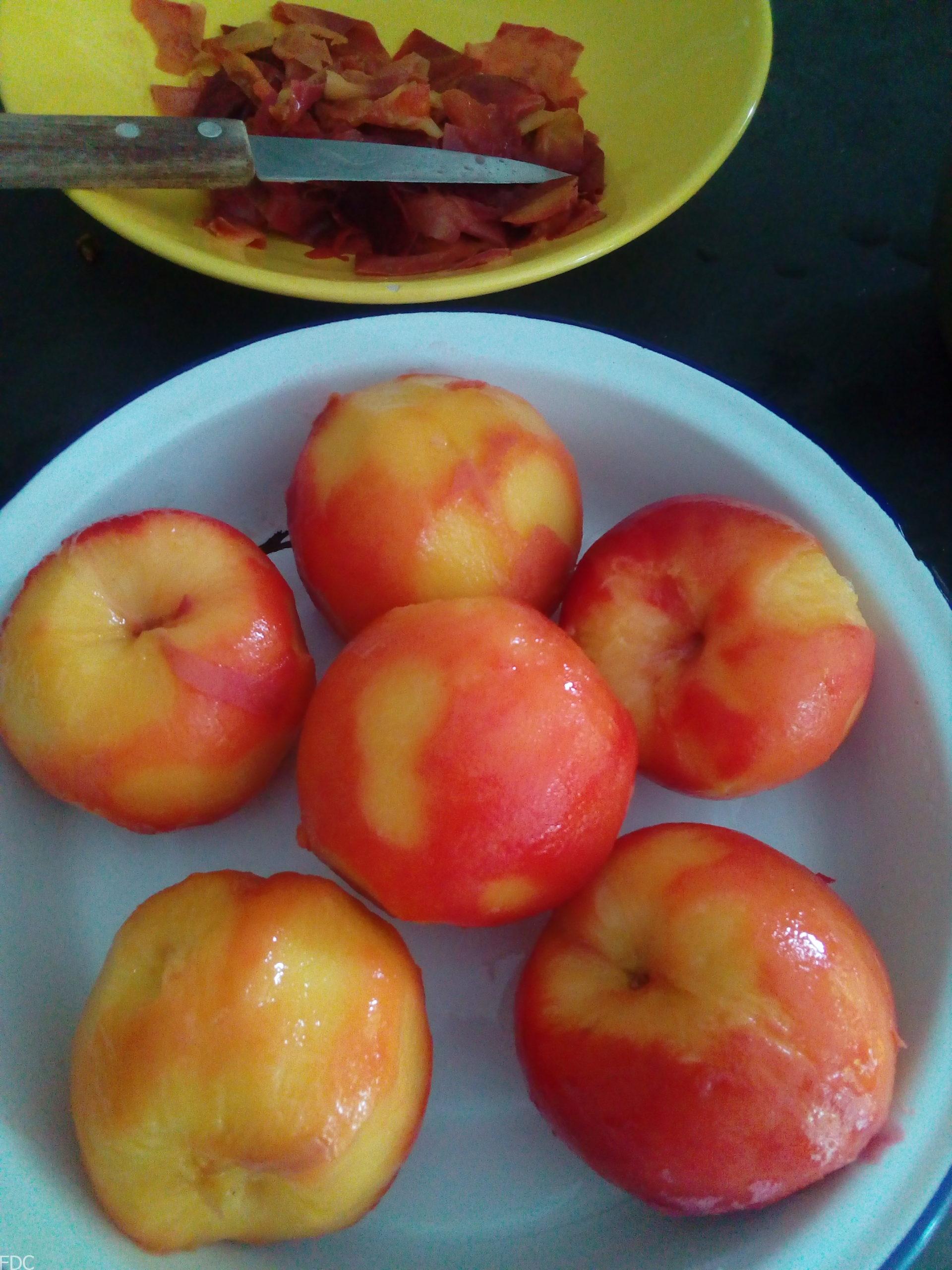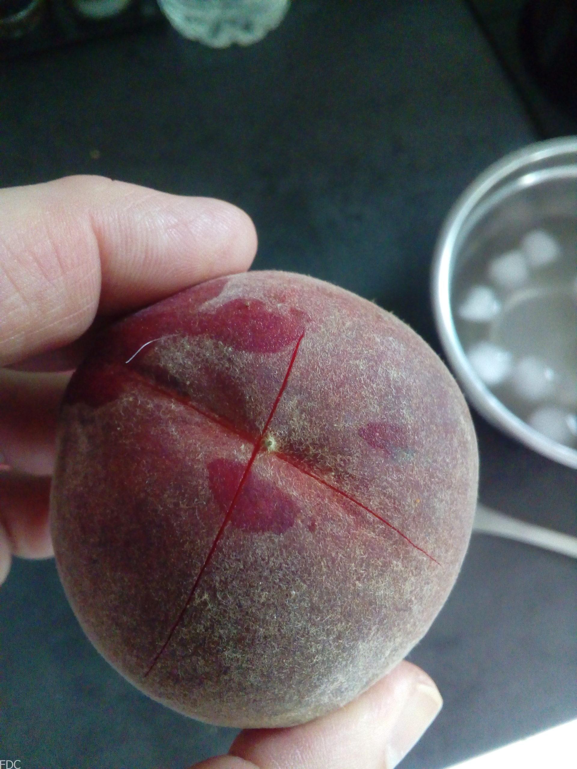 Préparez les pêches en les émondant comme pour les tomates dans l’eau bouillante. Attention c’est plus ou moins long selon si vos pêches sont molles ou dur.