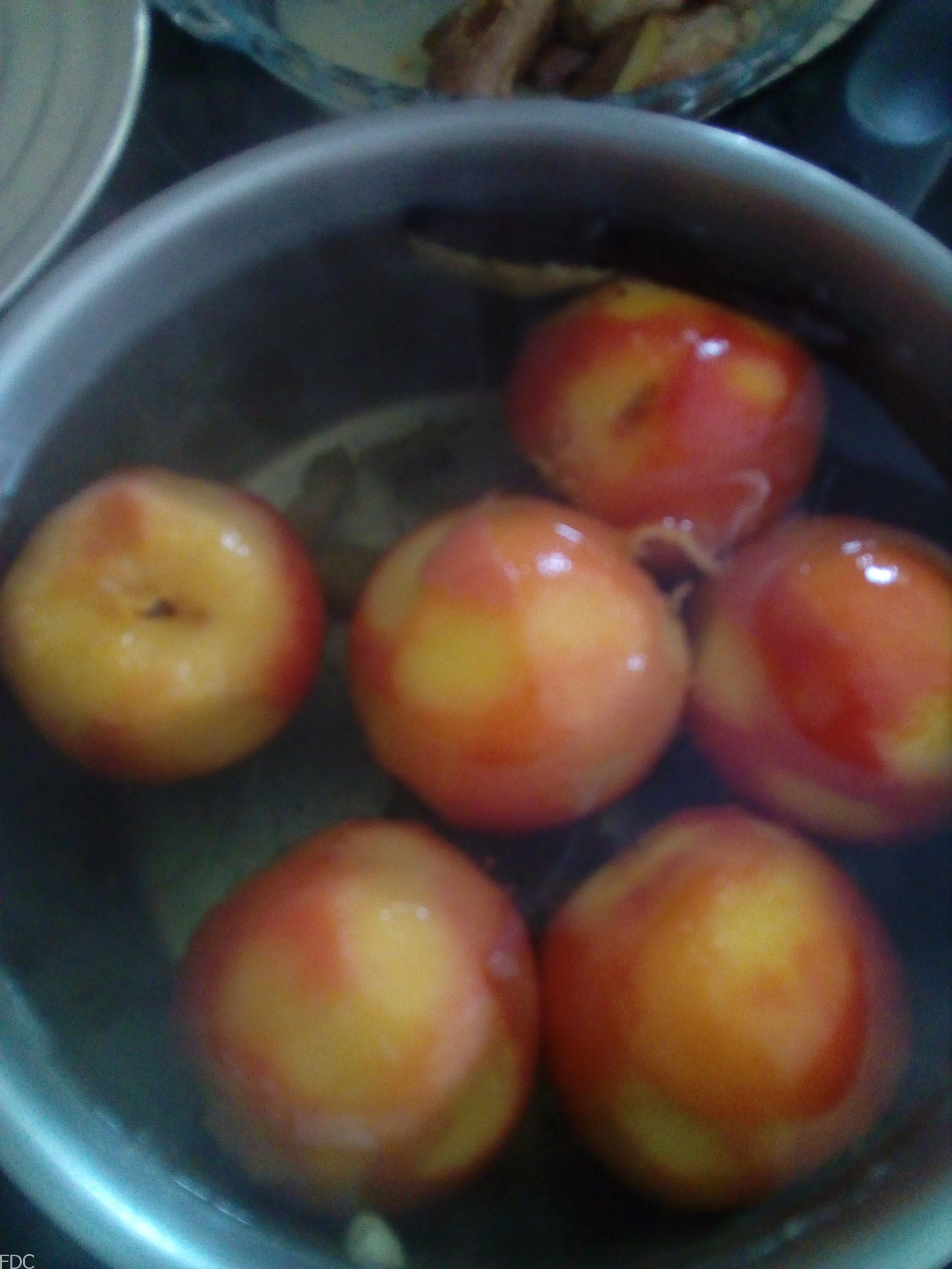 Portez à ébullition et plongez les pêches entières. Cuisson 10 à 15 minutes selon la maturité de vos fruits. Piquez de temps en temps avec une aiguille à brochette ou pointe de couteau, la lame doit pénétrer sans résistance.
