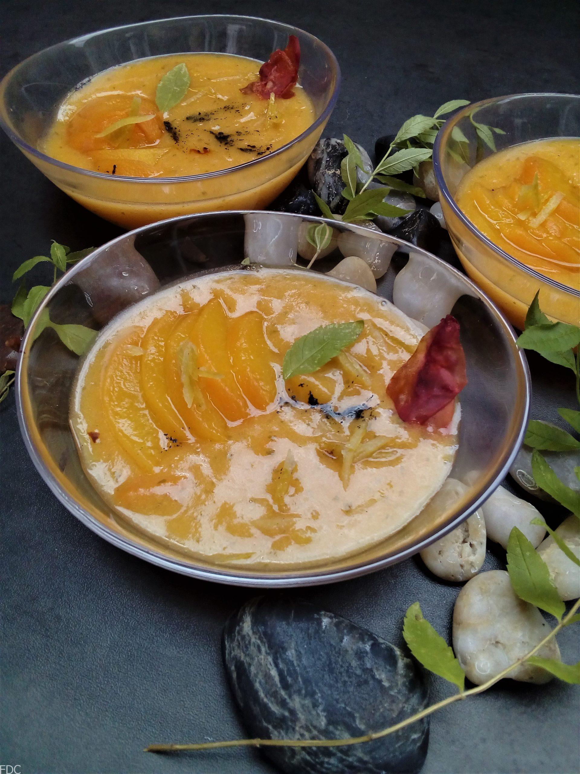 Pour cette recette je suis parti sur la verveine citron, vanille de la réunion et citron jaune Bio pour le sirop. Mais vous pouvez la faire à la menthe ou épices mais soyez vigilant au dosage afin que cela n’efface pas le parfum subtil de la pêche.
