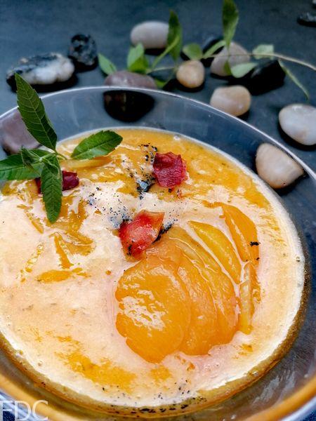 Dans de jolis bols, la soupe (10 à 15 cl), dessus les ¼ d’oreillons, feuilles de verveines, les chips de peau de pêche et ouvrez la gousse de vanille et répartissez les grains.